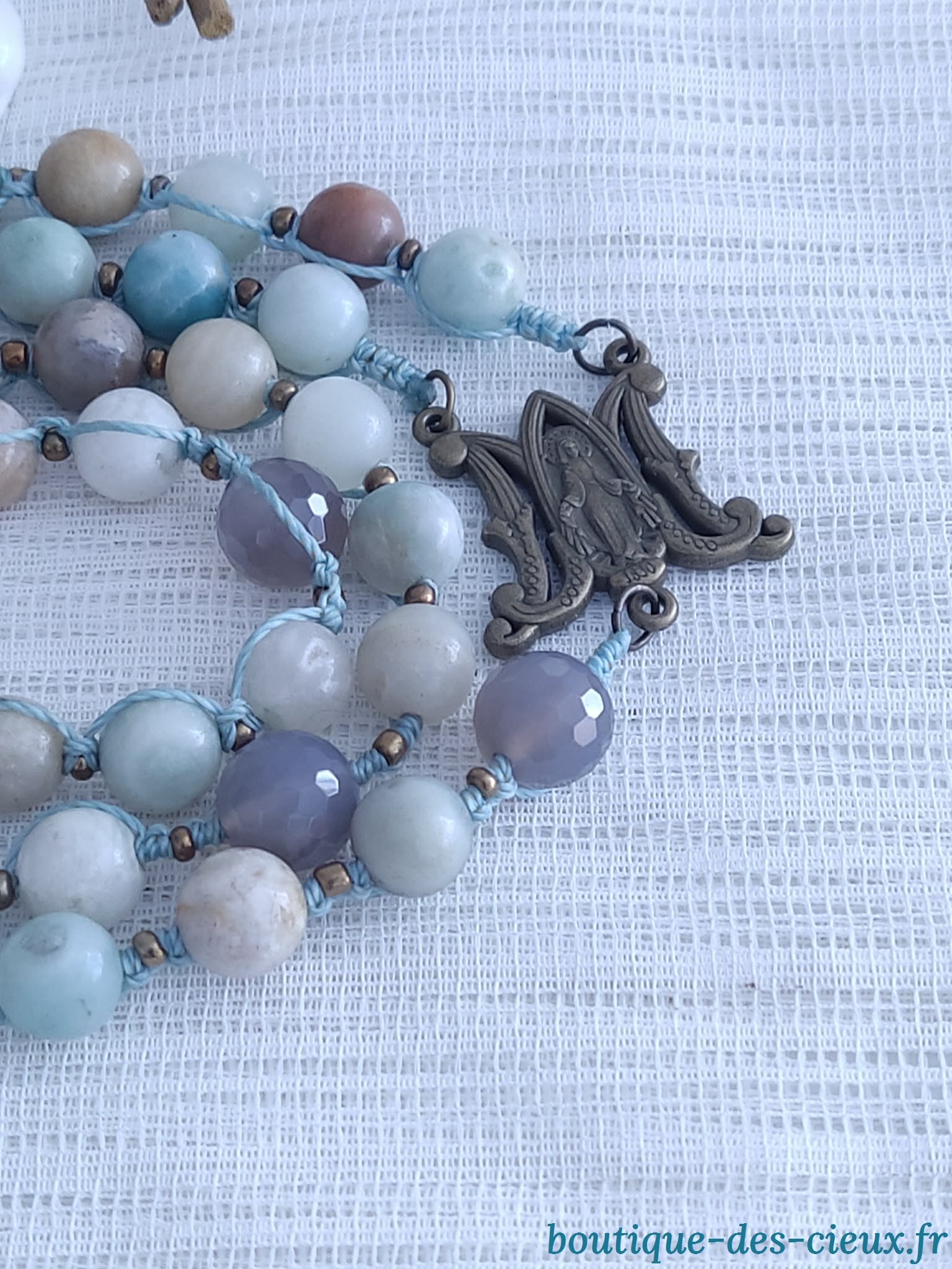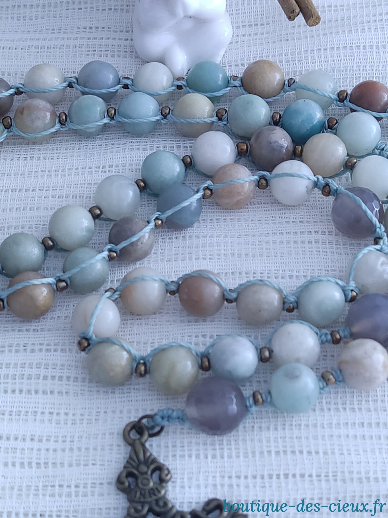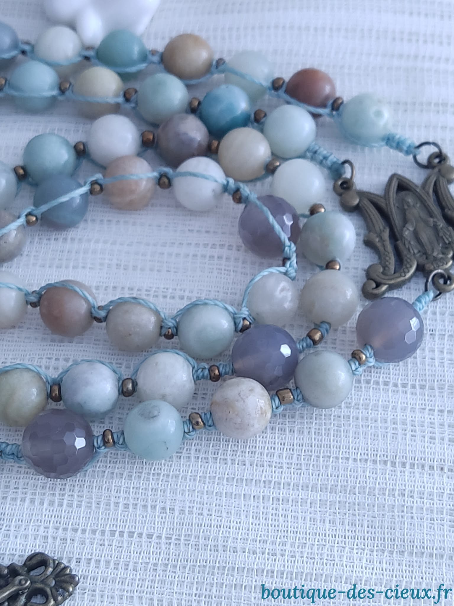 Chapelet / collier pour femme composé de pierres naturelles amazonite (éveille la joie de vire) et agate grise (favorise la stabilité), ainsi que de belles pièces en métal bronze. Vous souhaitez prier le chapelet, mais ne savez pas comment procéder : rendez vous dans les pages à votre disposition. Vous y trouverez des explications et un livret complet téléchargeable en format pdf vous y est offert. |