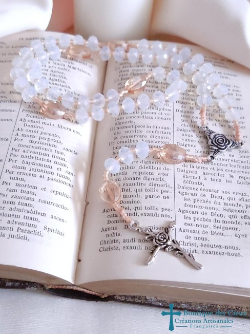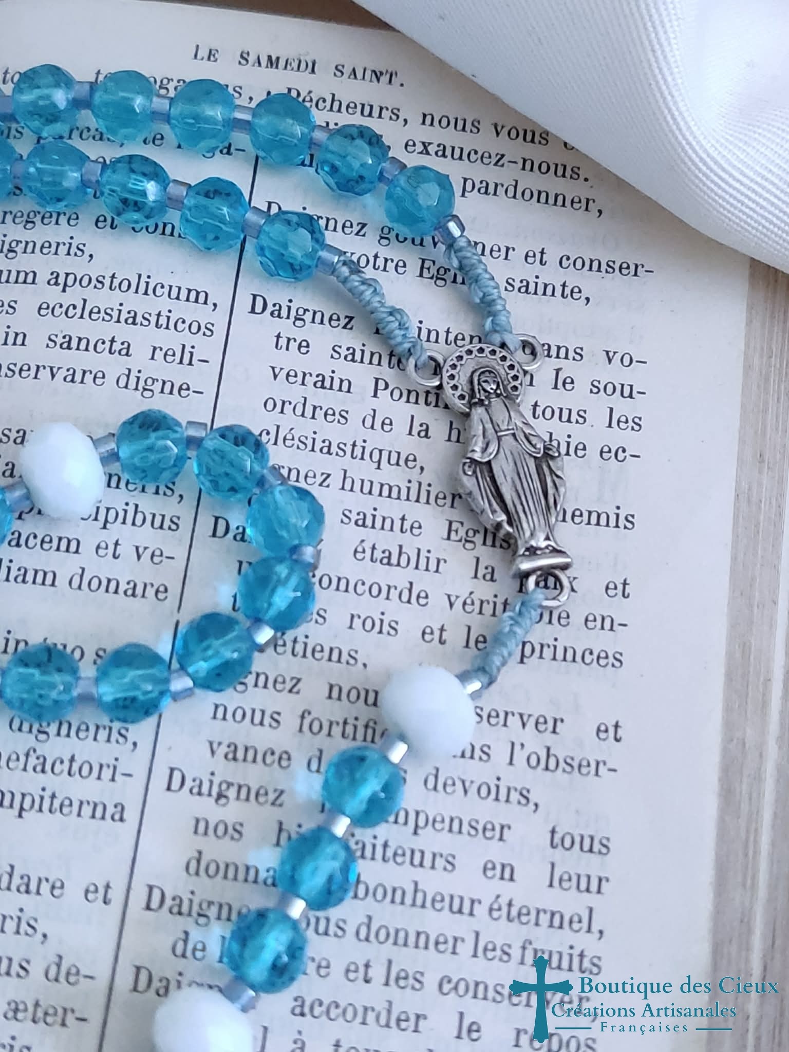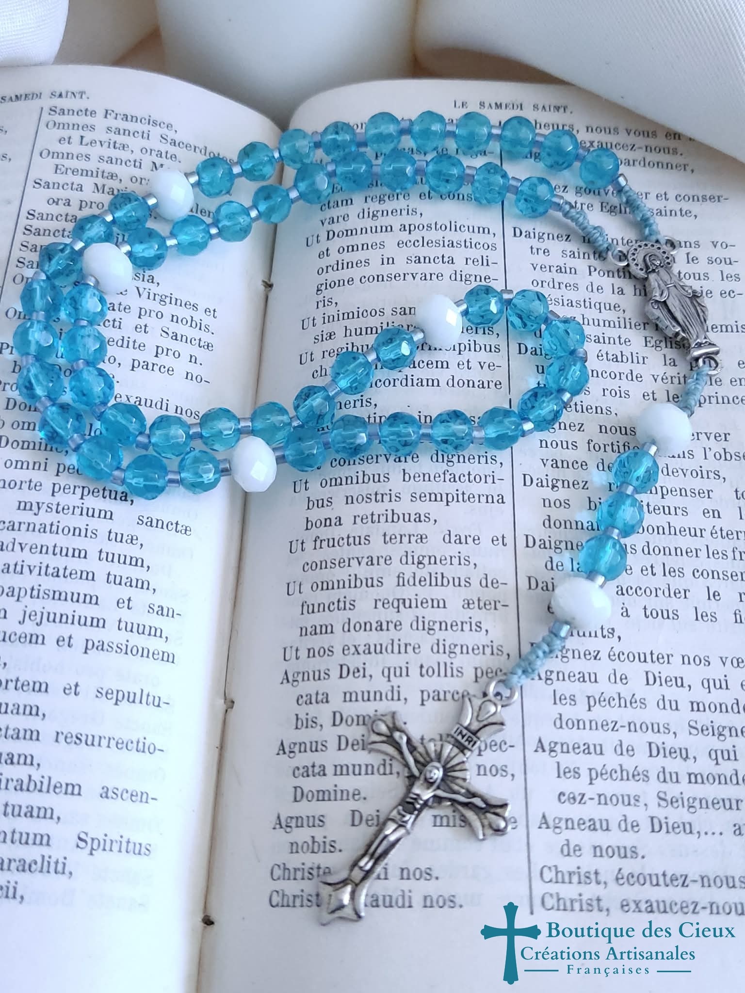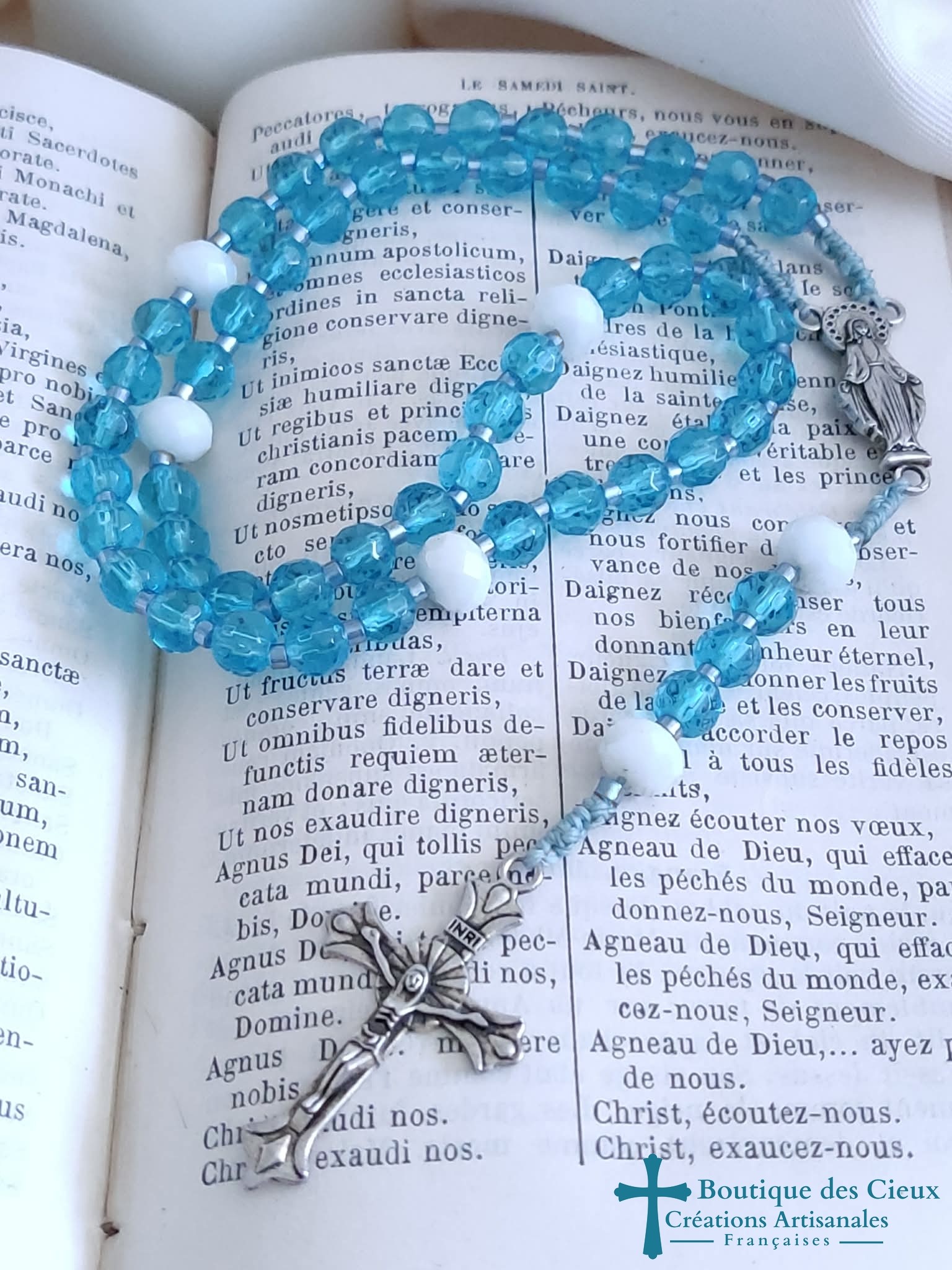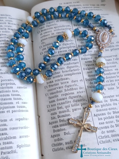 Chapelet composé de perles en verre bleu et blanc et de pièces en métal argenté.Les grains sont facilement discernables grâce aux petites perles qui les séparent, et la différence de taille et forme pour les "Notre Père".De texture souple, il est facilement glissable dans vos poches.