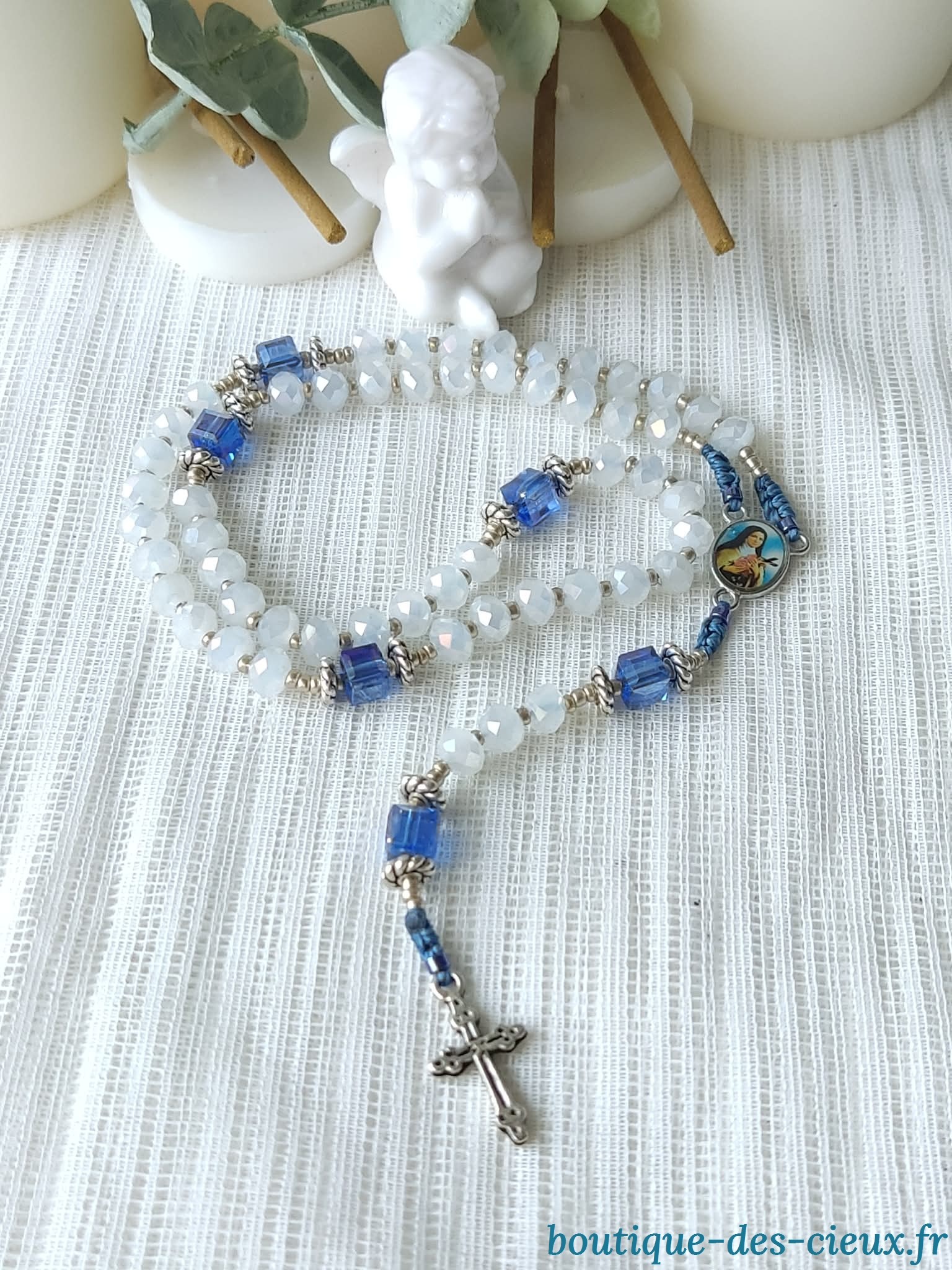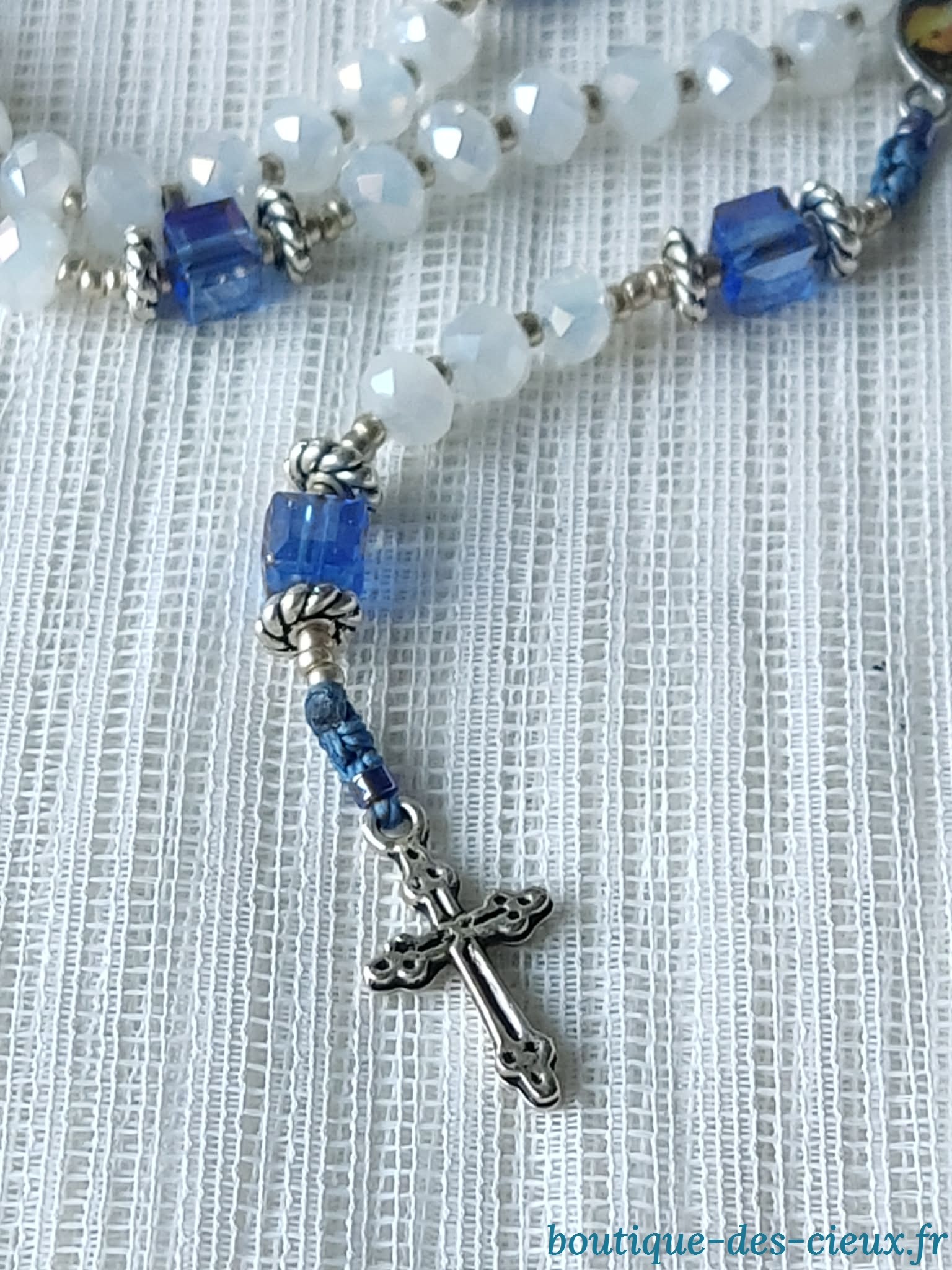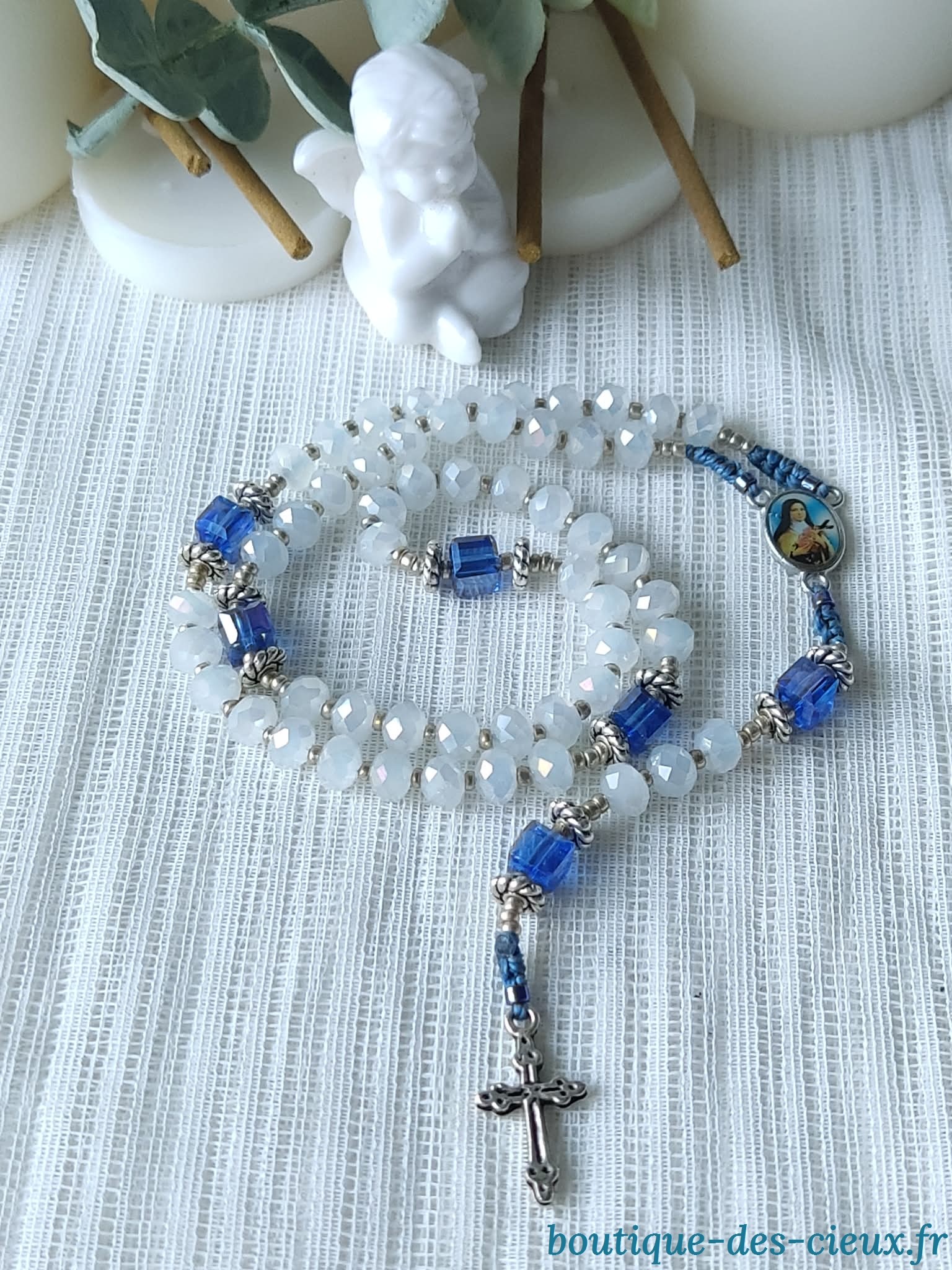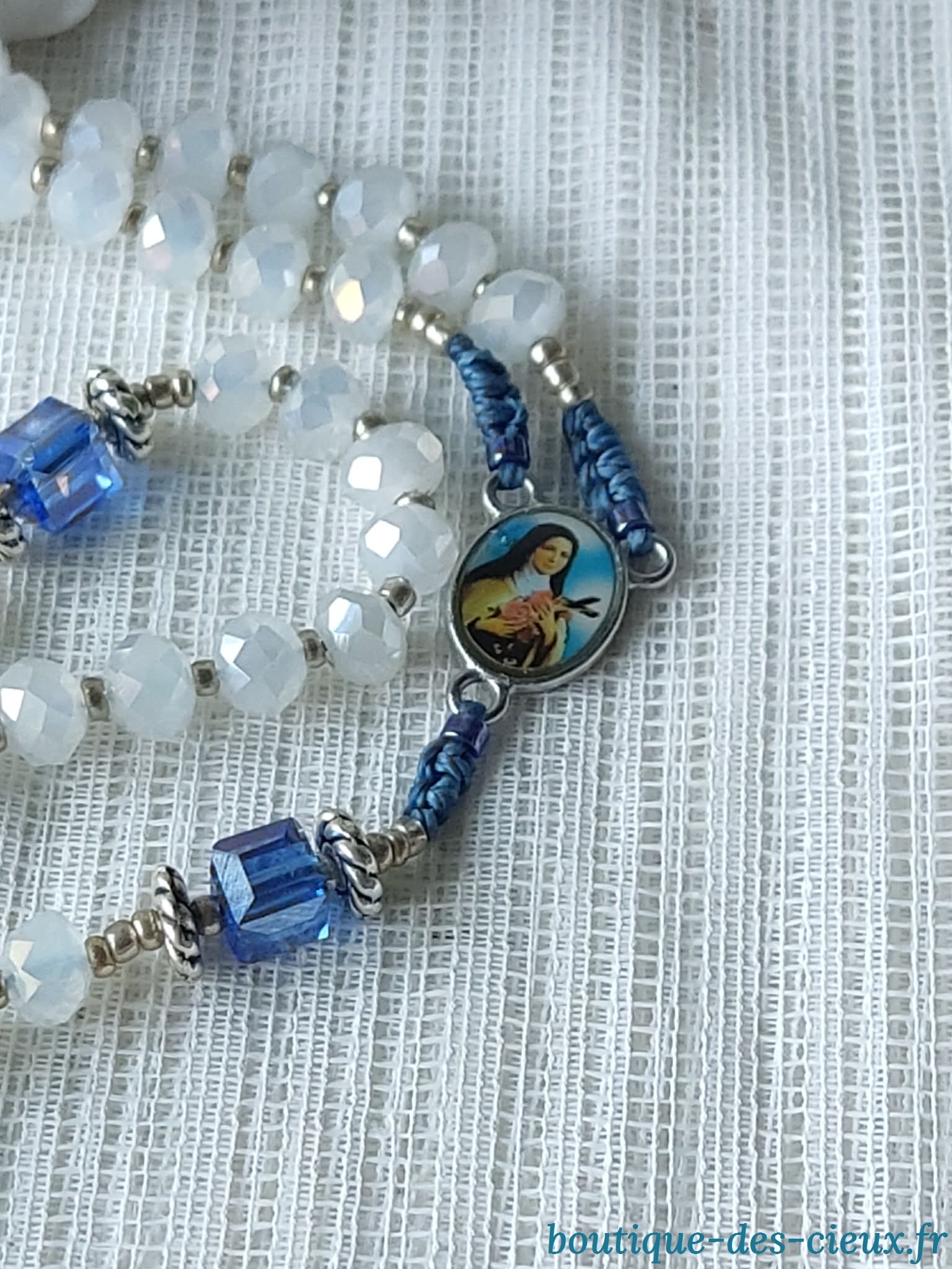 Chapelets Sainte Rita (cause désespérée) composés de perles facettées en verre blanc, cubes en verre et de pièces en métal argenté.