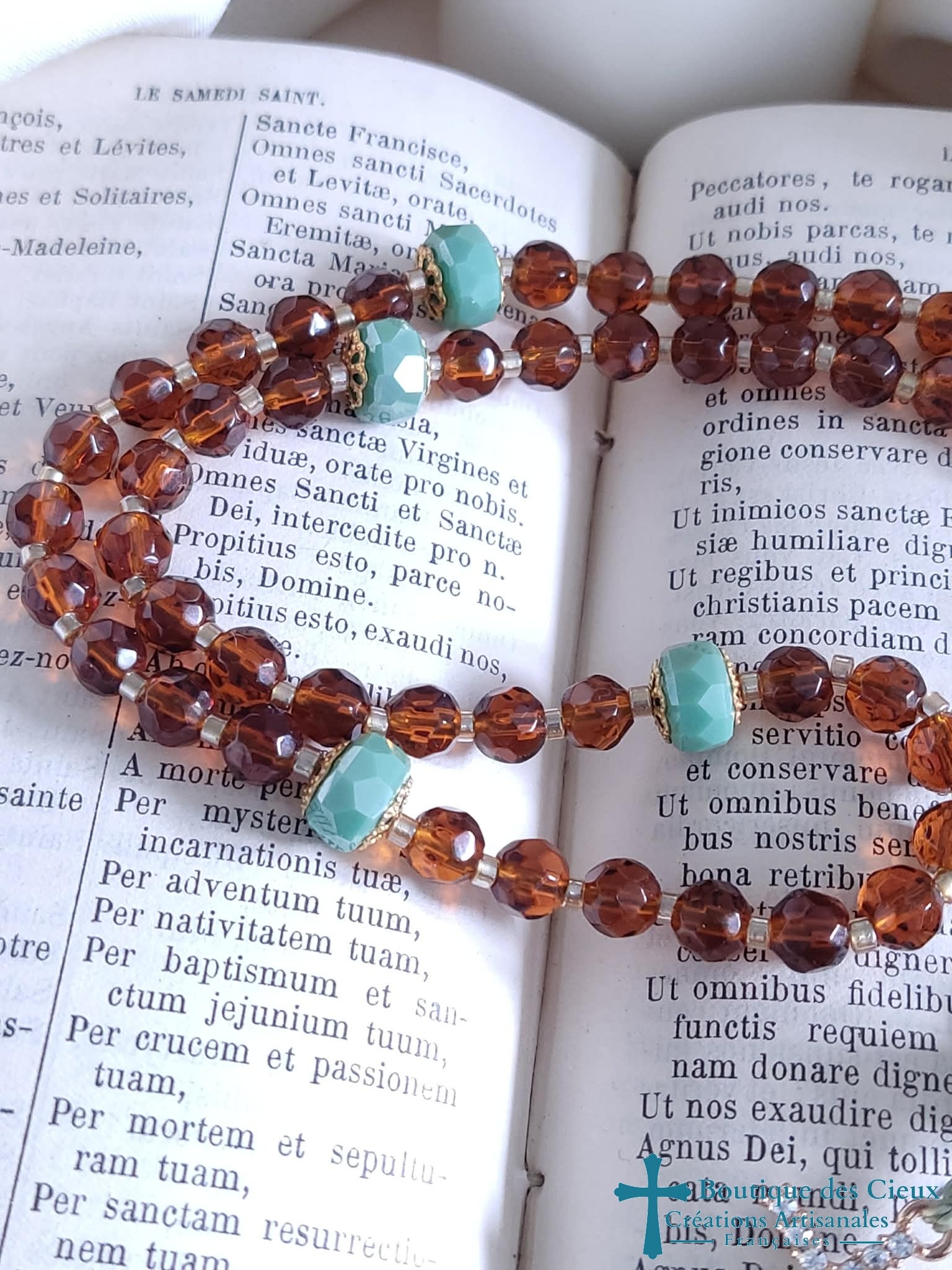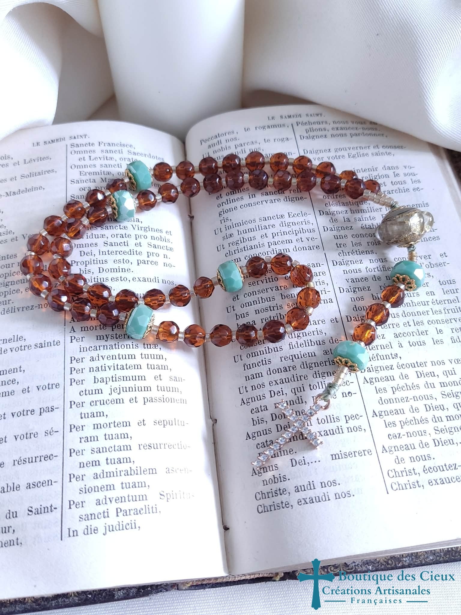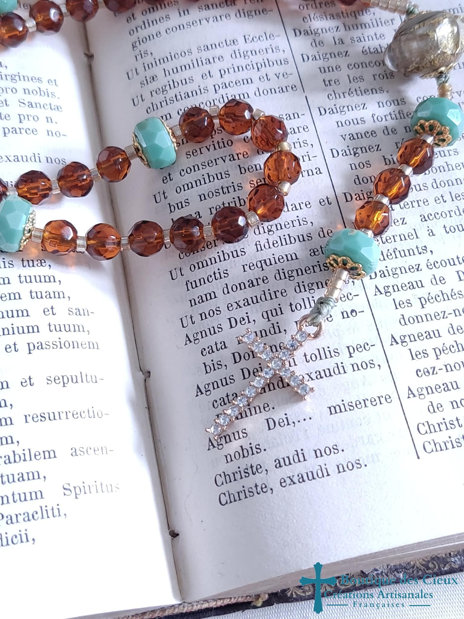 Chapelet pour femme composé de perles en verre facetté marron, magnifique perle en verre filé d'art avec inclusion de feuille d'or, et belle croix dorée à strass.