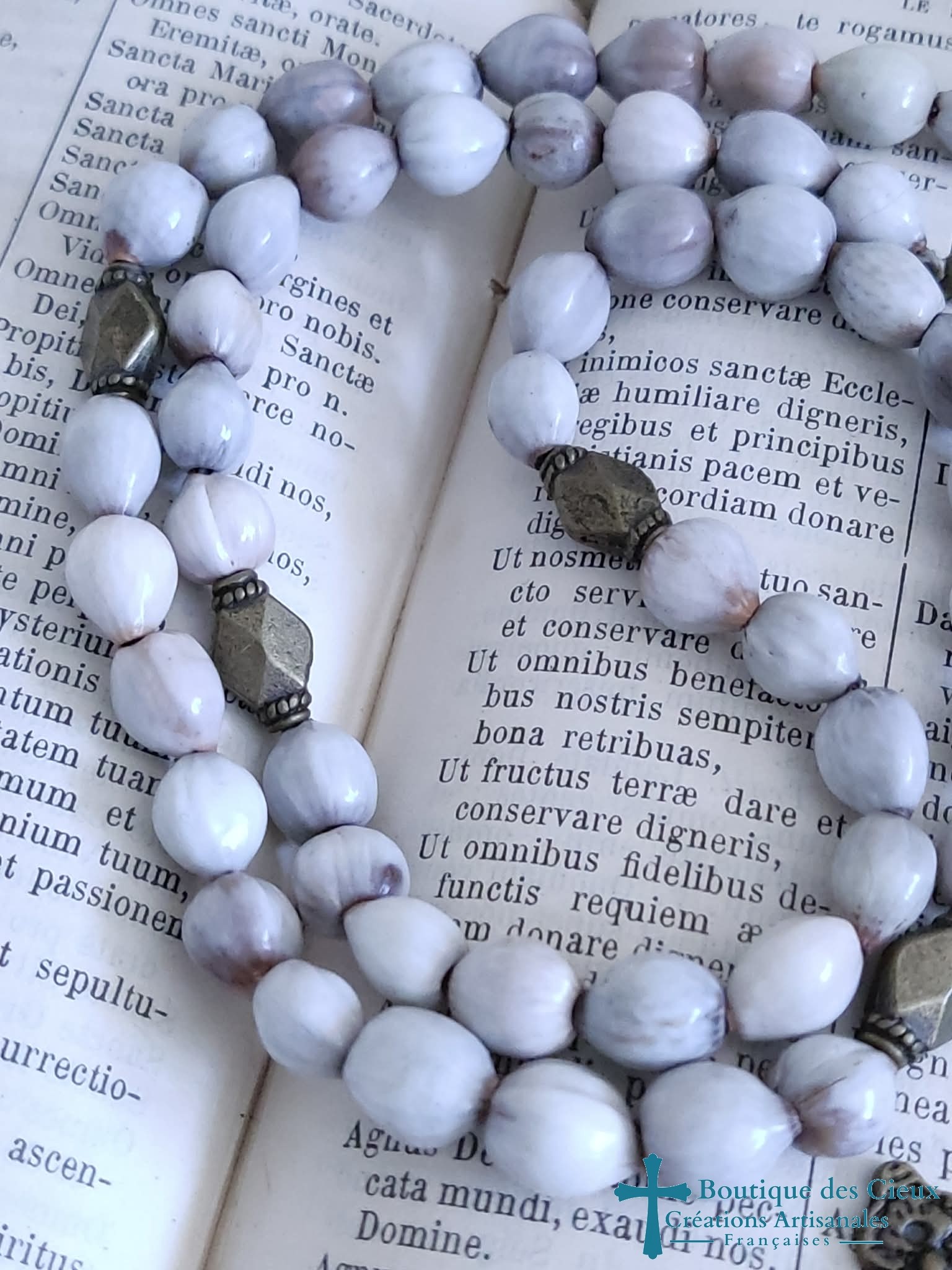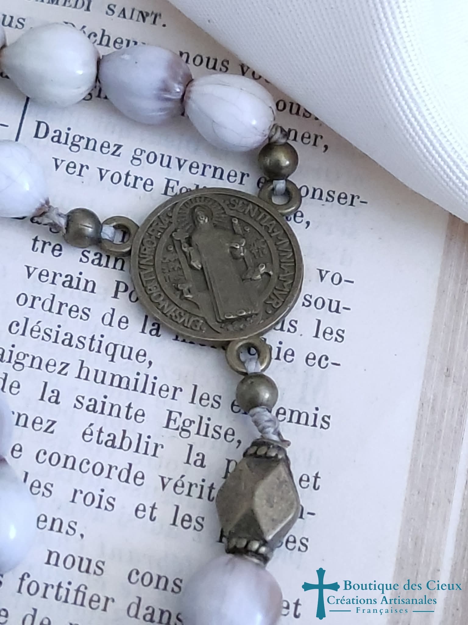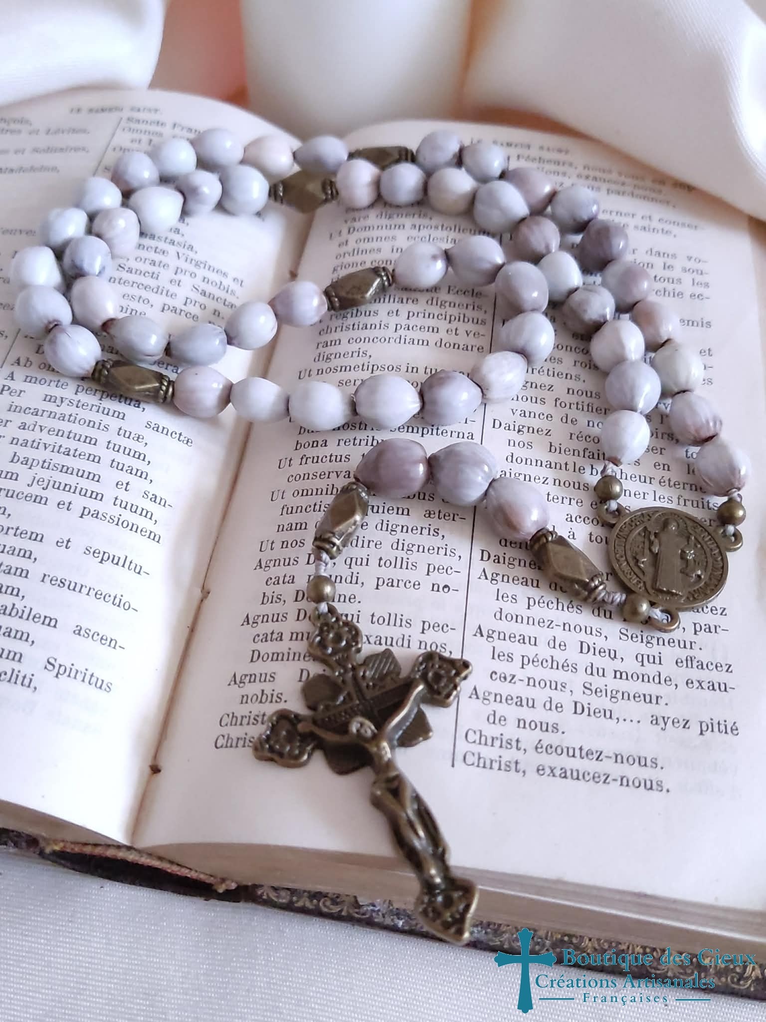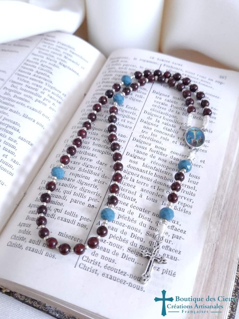 Petit chapelet composé de graines naturelles recouverte de polymère, ainsi que d'un connecteur Saint Benoît et croix en métal bronze. Entièrement montés à la main, les grains glissent sur le fil pour un repère simple des dizaines, les "Notre Père" quant à eux sont distinguables grâce à la différence de forme . Très souple, il se glisse facilement n'importe où, protégé par son pochon. Vous souhaitez prier le chapelet, mais ne savez pas comment procéder : rendez vous dans les pages à votre disposition. Vous y trouverez des explications et un livret complet téléchargeable en format pdf vous y est offert. |