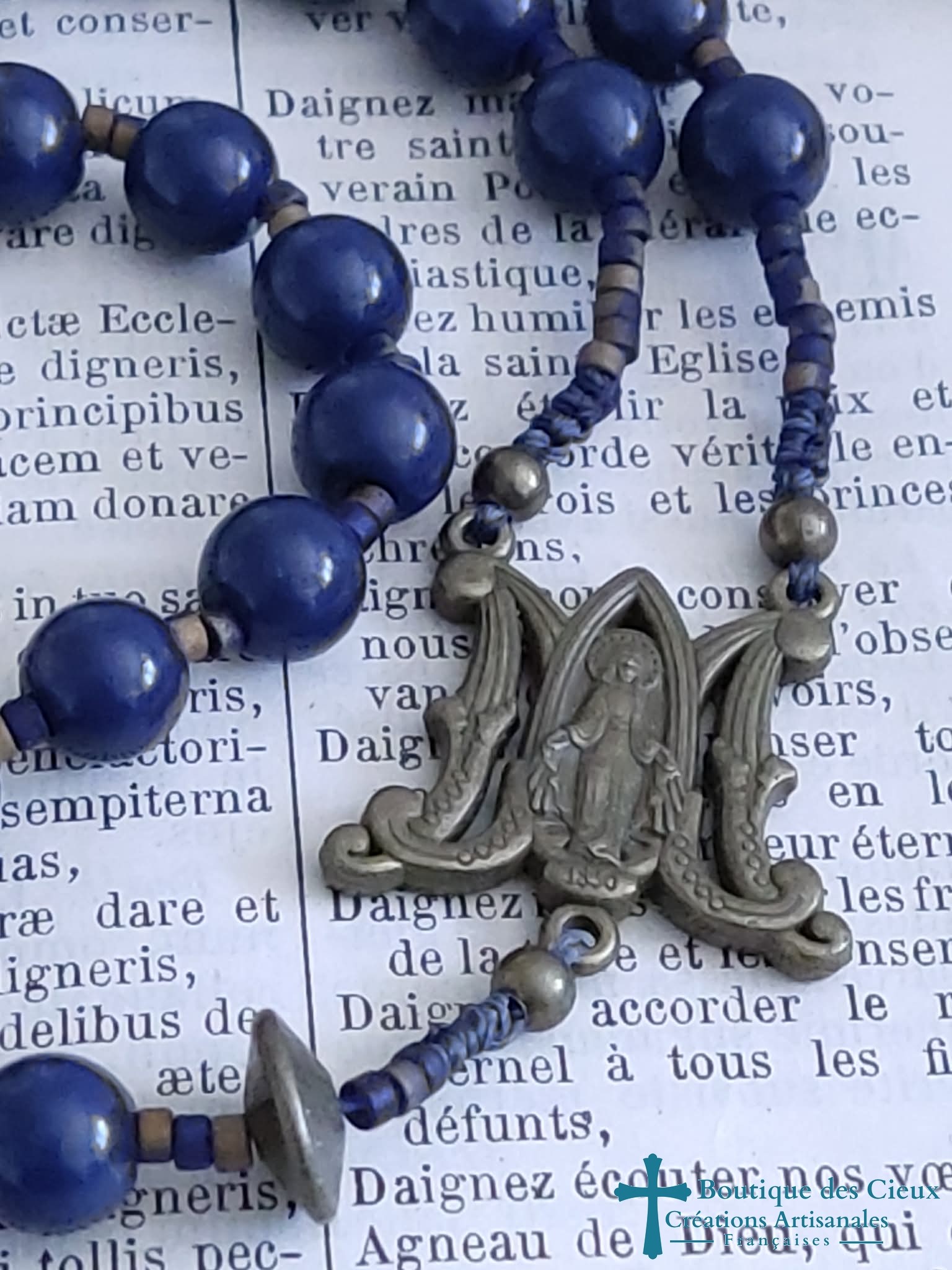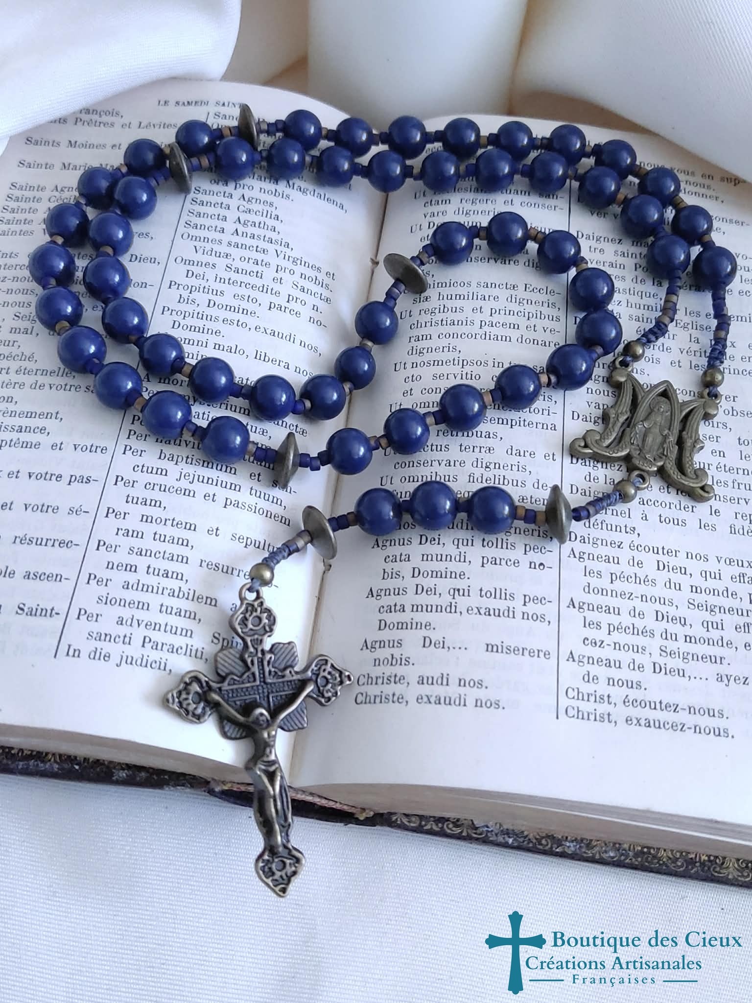 Chapelet pour homme composé de perles en verre bleu nuit et diverses pièces en métal bronze. Entièrement monté à la main, les grains des dizaines sont facilement discernables grâce aux petites perles qui les séparent, et la différence de forme avec les "Notre Père". Souple il est facilement transportable. Vous souhaitez prier le chapelet, mais ne savez pas comment procéder : rendez vous dans les pages à votre disposition. Vous y trouverez des explications et un livret complet téléchargeable en format pdf vous y est offert. |