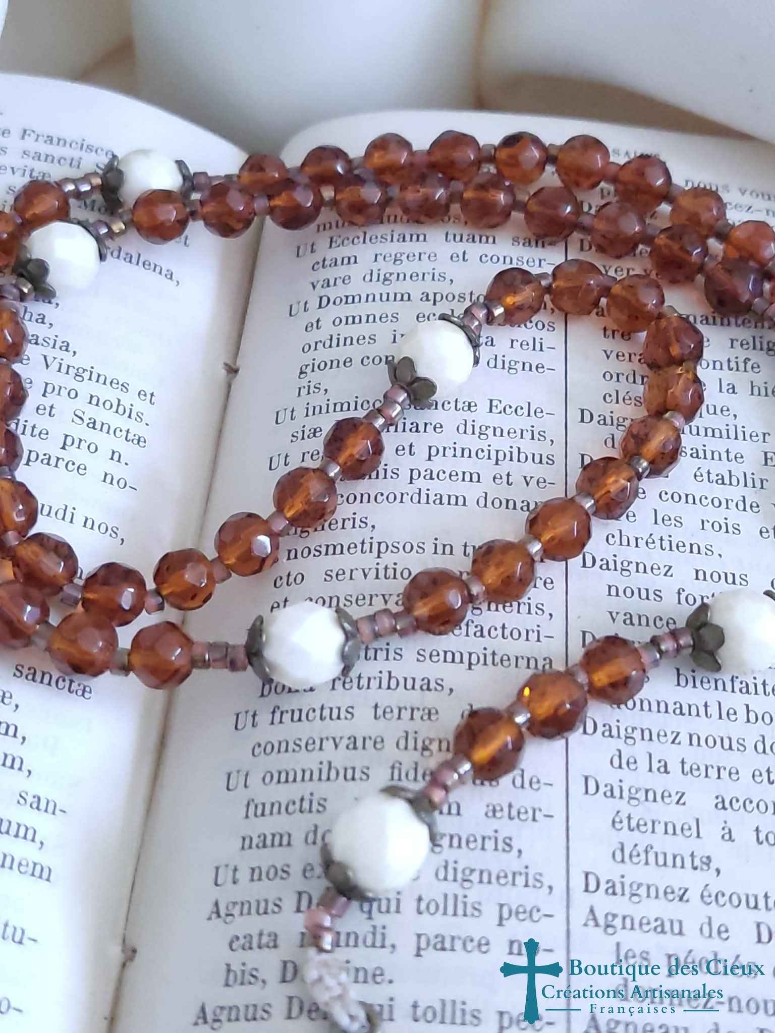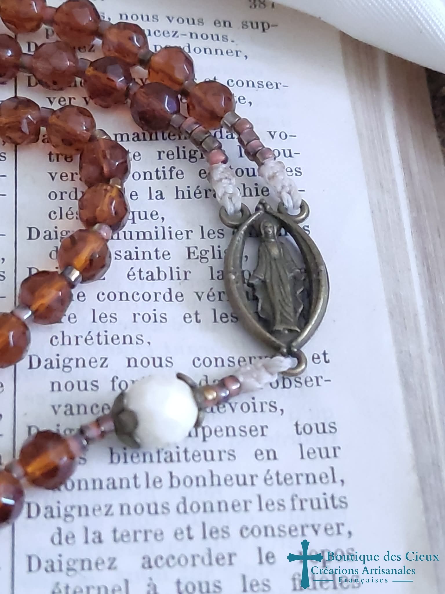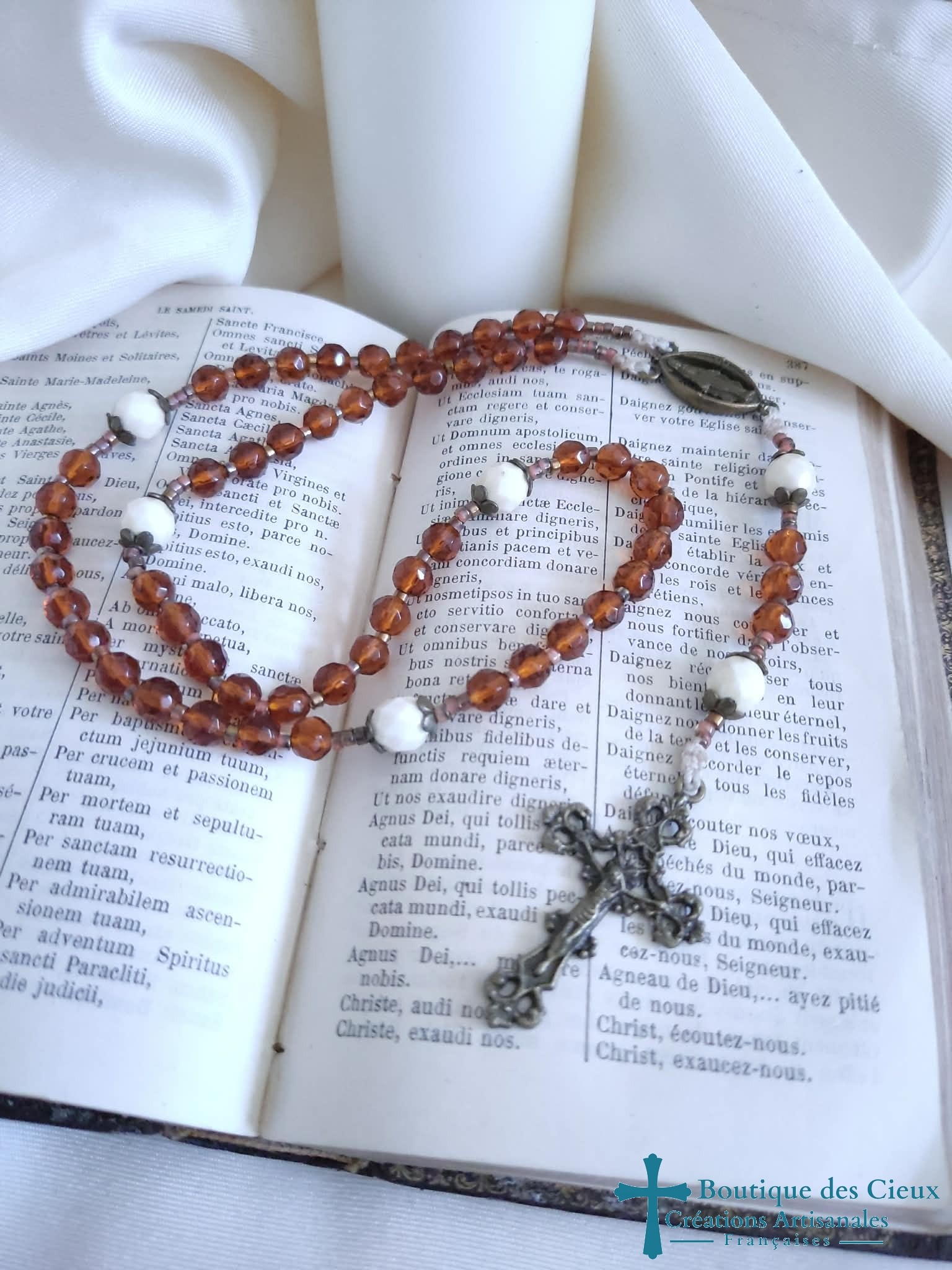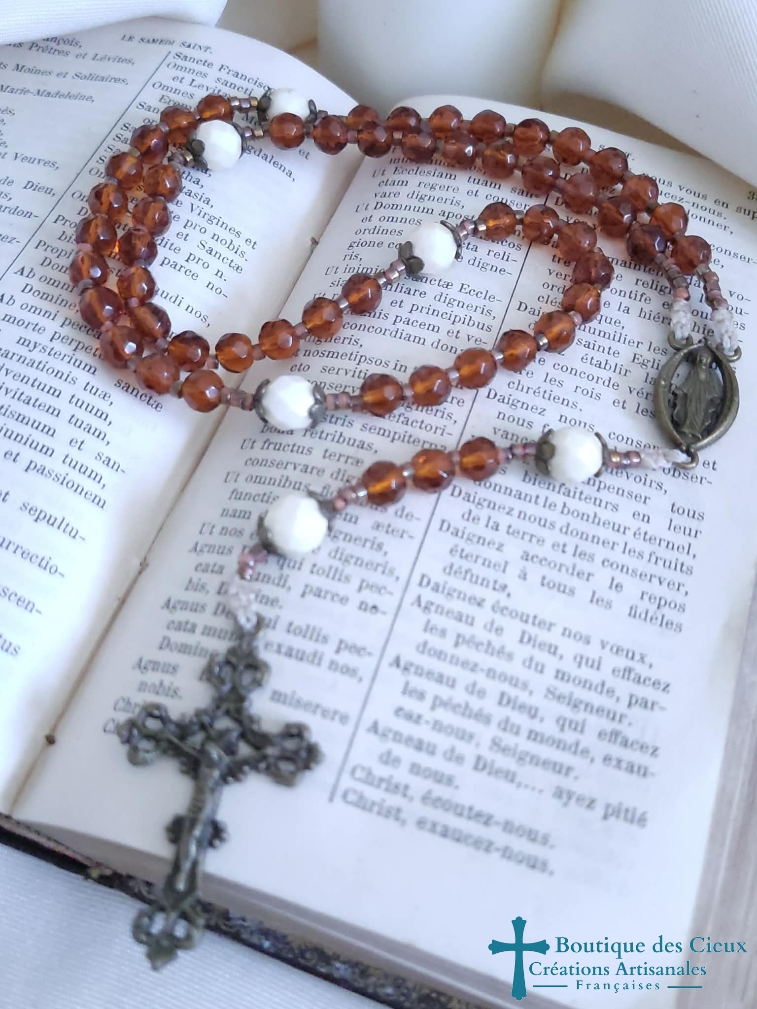 Chapelet pour femme composé de perles en verre facetté marron et ivoire, ainsi que de diverses pièces en métal bronze. Les grains des dizaines sont facilement discernables grâce aux petites perles qui les séparent, ainsi qu'à la différence de forme des "Notre Père". Très souple, il se glisse facilement n'importe où protégé par son pochon.