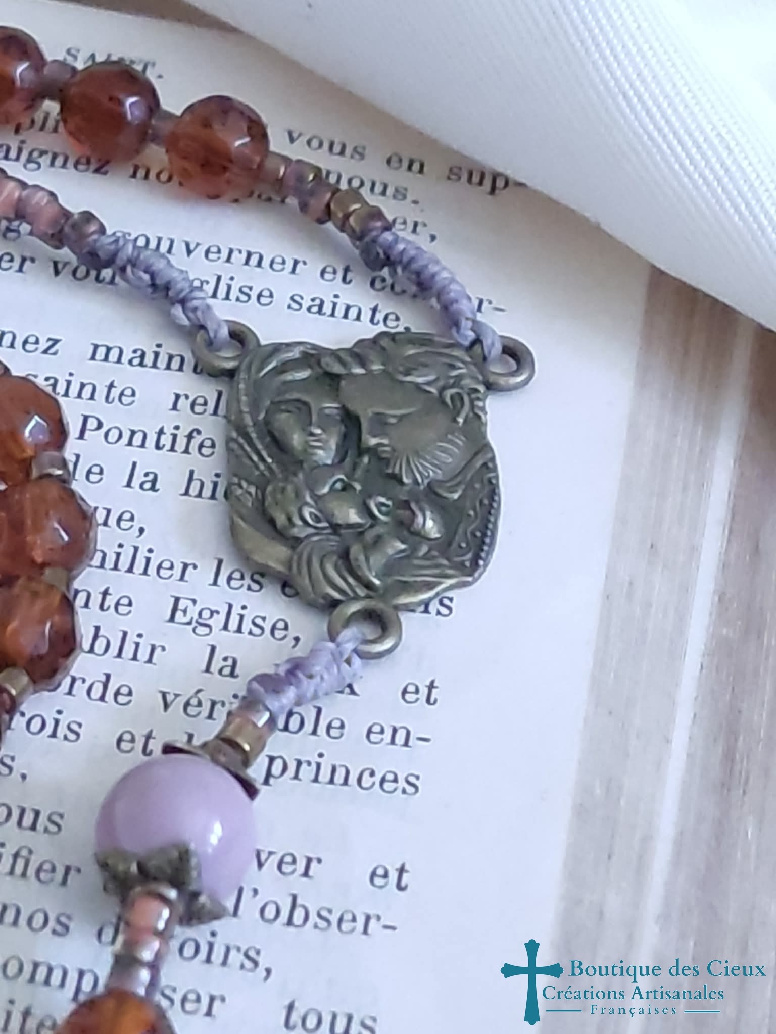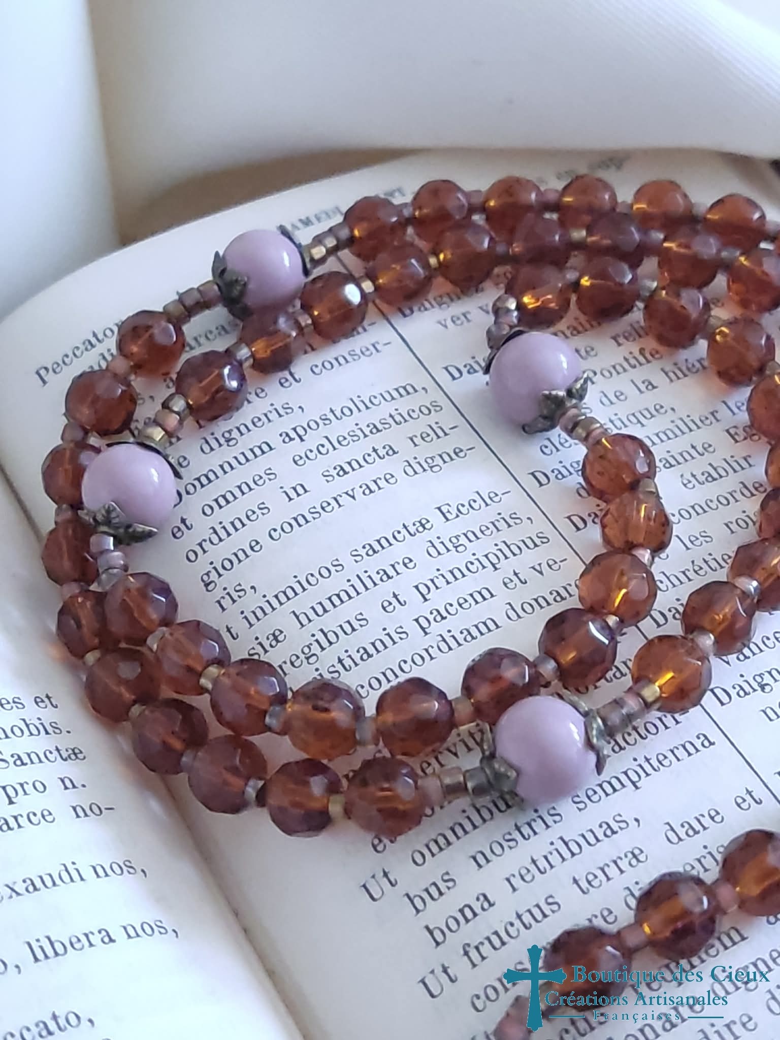 Chapelet pour femme composé de perles en verre facetté marron et parme, ainsi que de diverses pièces en métal bronze. Les grains des dizaines sont facilement discernables grâce aux petites perles qui les séparent, ainsi qu'à la différence de forme des "Notre Père". Très souple, il se glisse facilement n'importe où protégé par son pochon.