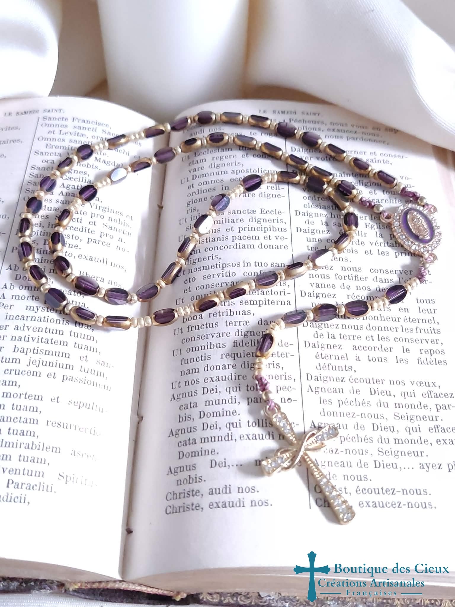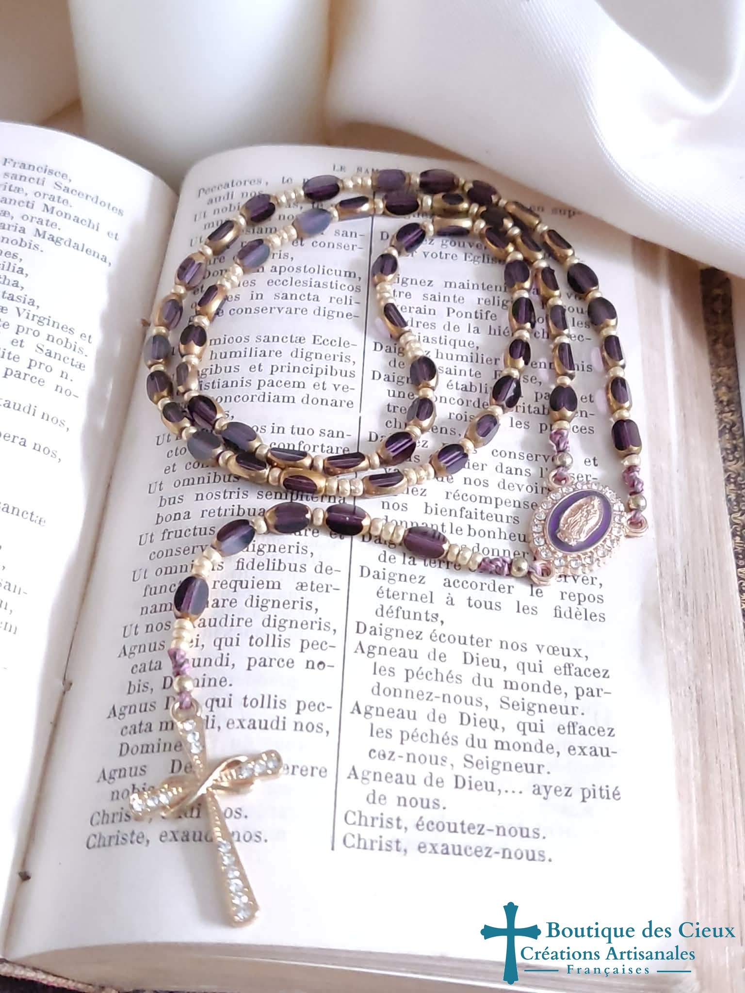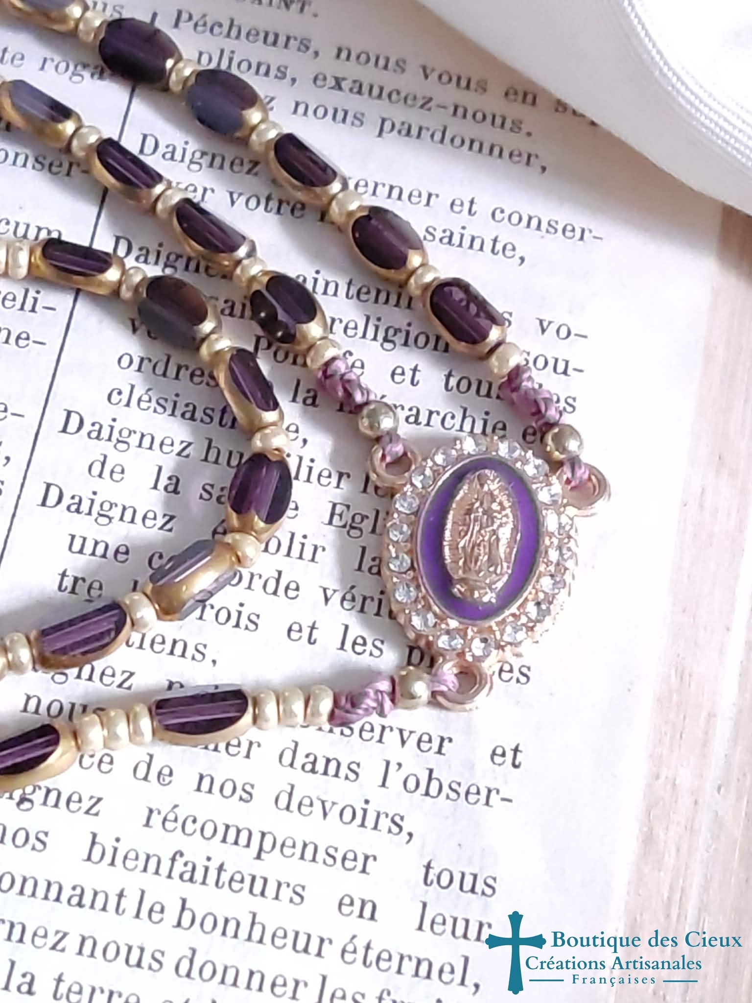 Chapelet en verre forme grain de riz améthyste transparent avec centre violet à strass et croix doré à strass