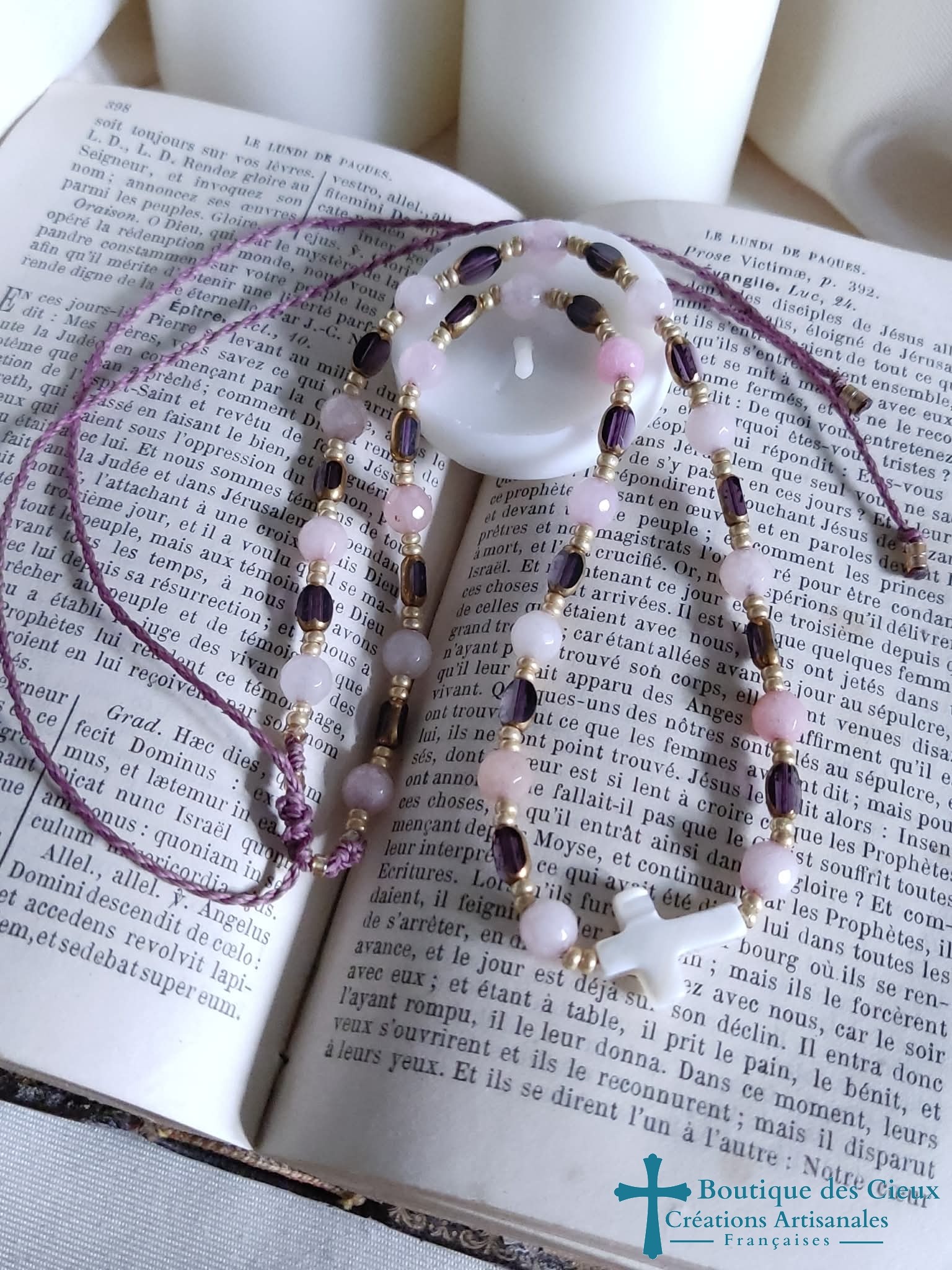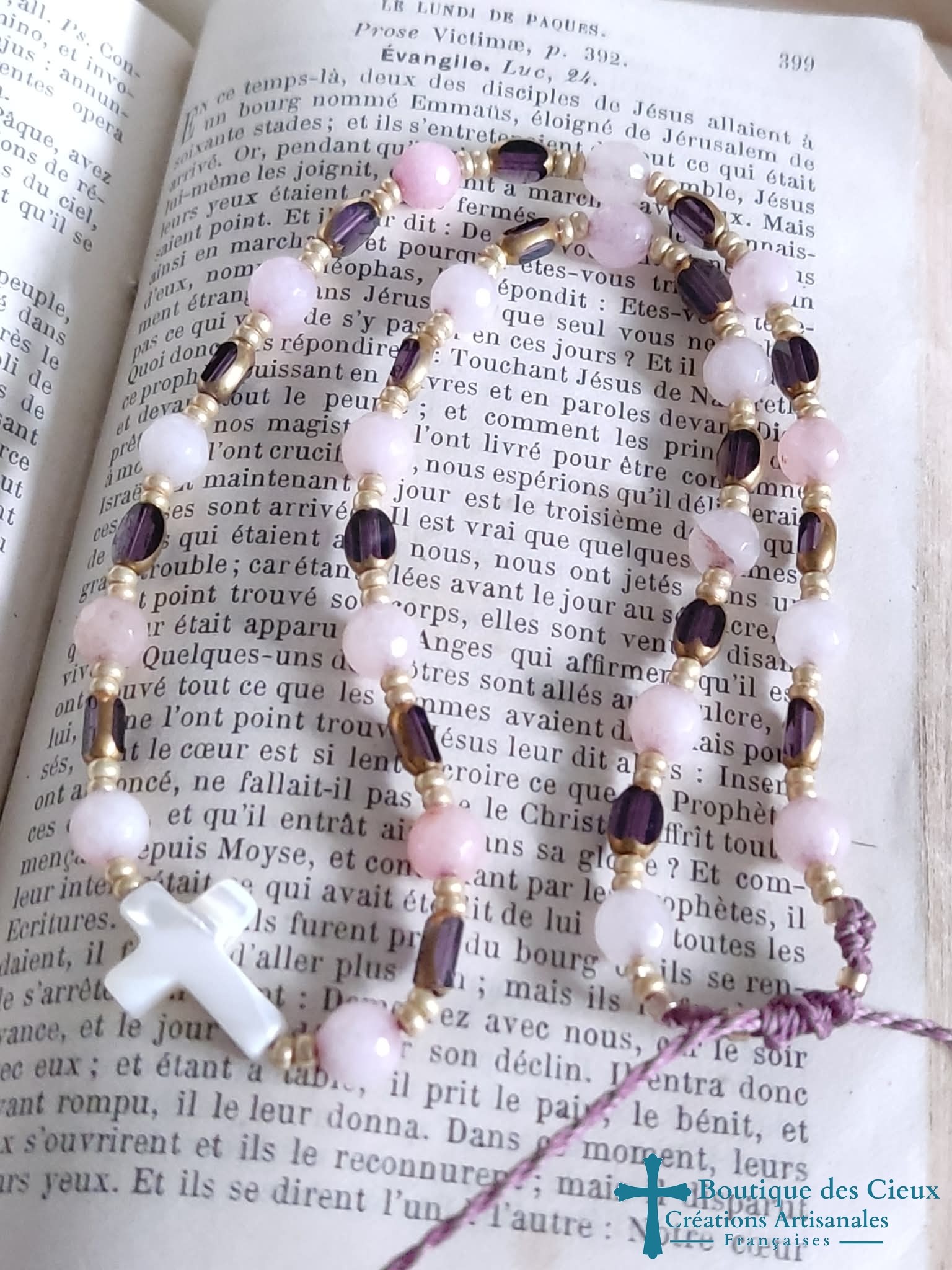 Croix en nacre entourée de quartz rose et grain de riz en verre. Montage à la main sur un fil polyester. Longueur réglable. Tous nos bijoux sont pensés et créés avec créativité et originalité pour vous permettre d'exprimer votre foi chrétienne en douceur tout en vous sublimant. Ce bijou sera béni par un prêtre. |