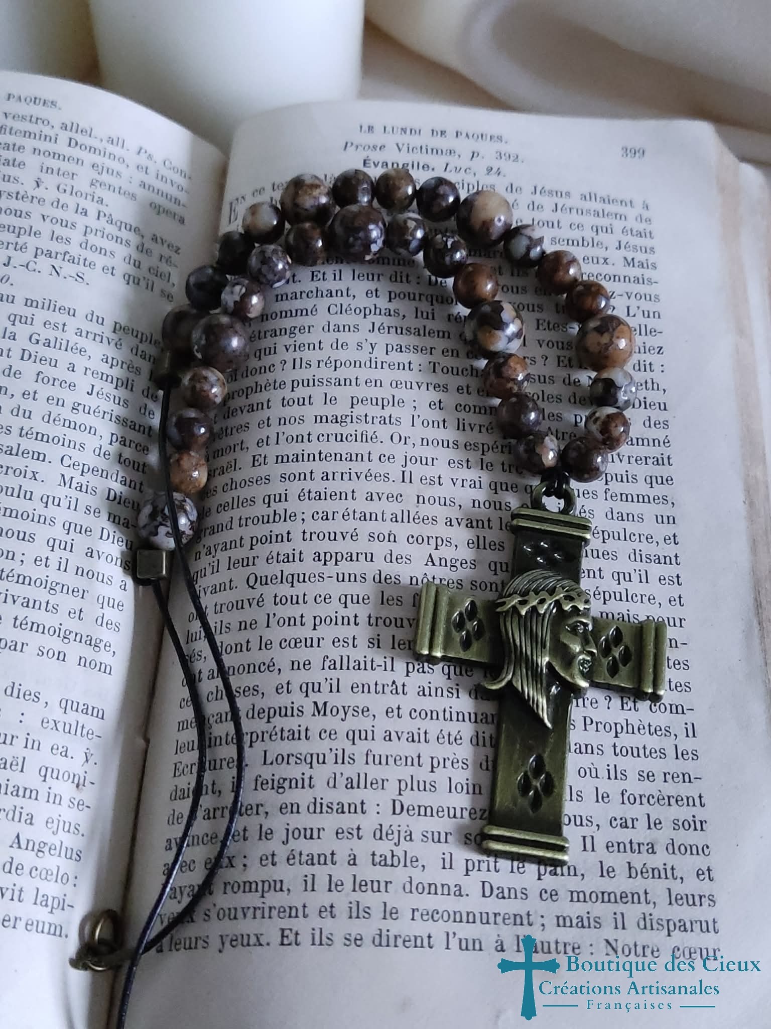 Magnifique croix avec tête du Christ en relief, et perles de jaspe montées sur un fil fin imitation cuir noir. Tous nos bijoux sont pensés et créés avec créativité et originalité pour vous permettre d'exprimer votre foi en douceur tout en vous sublimant. Ce bijou sera béni par un prêtre. |