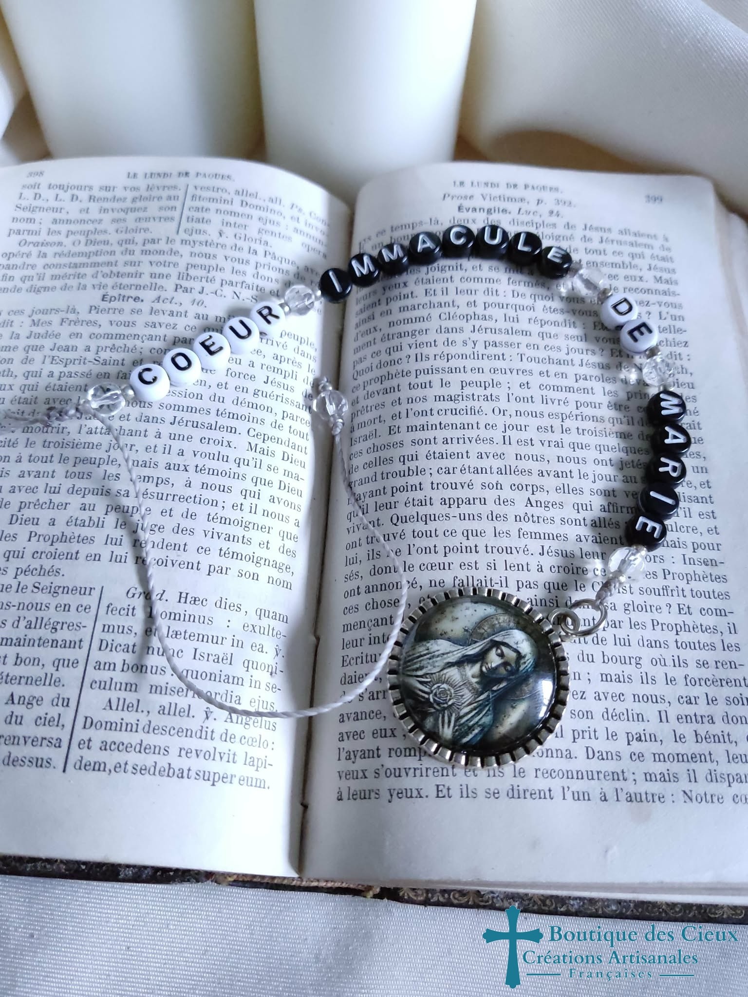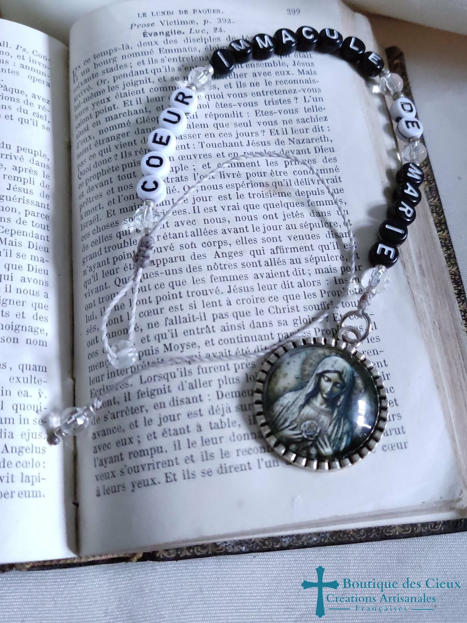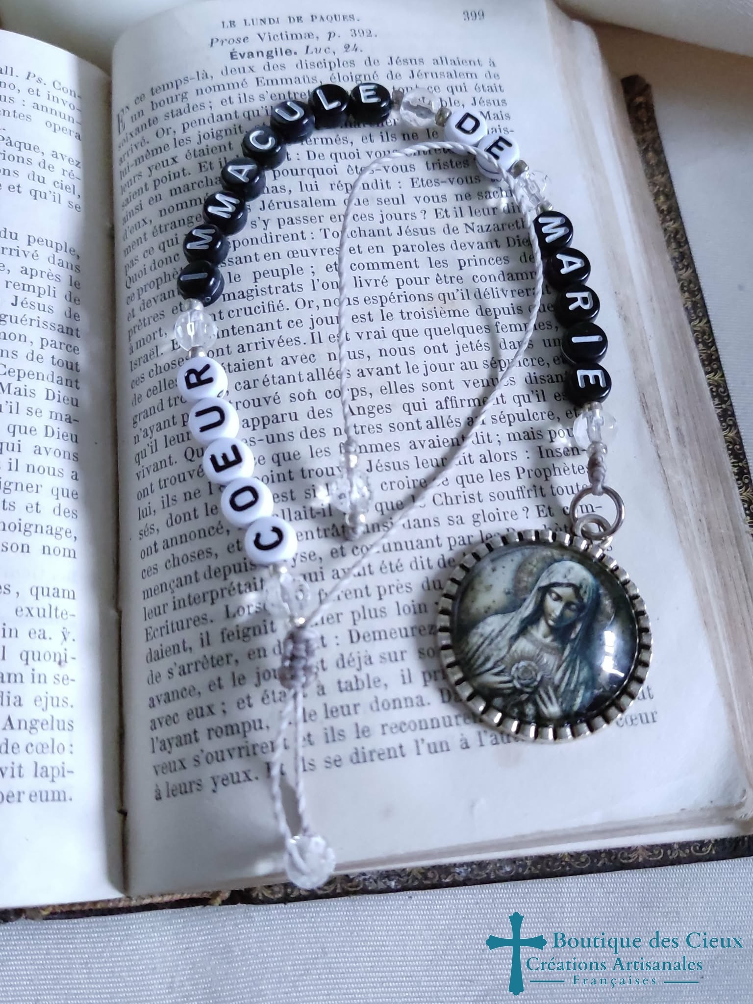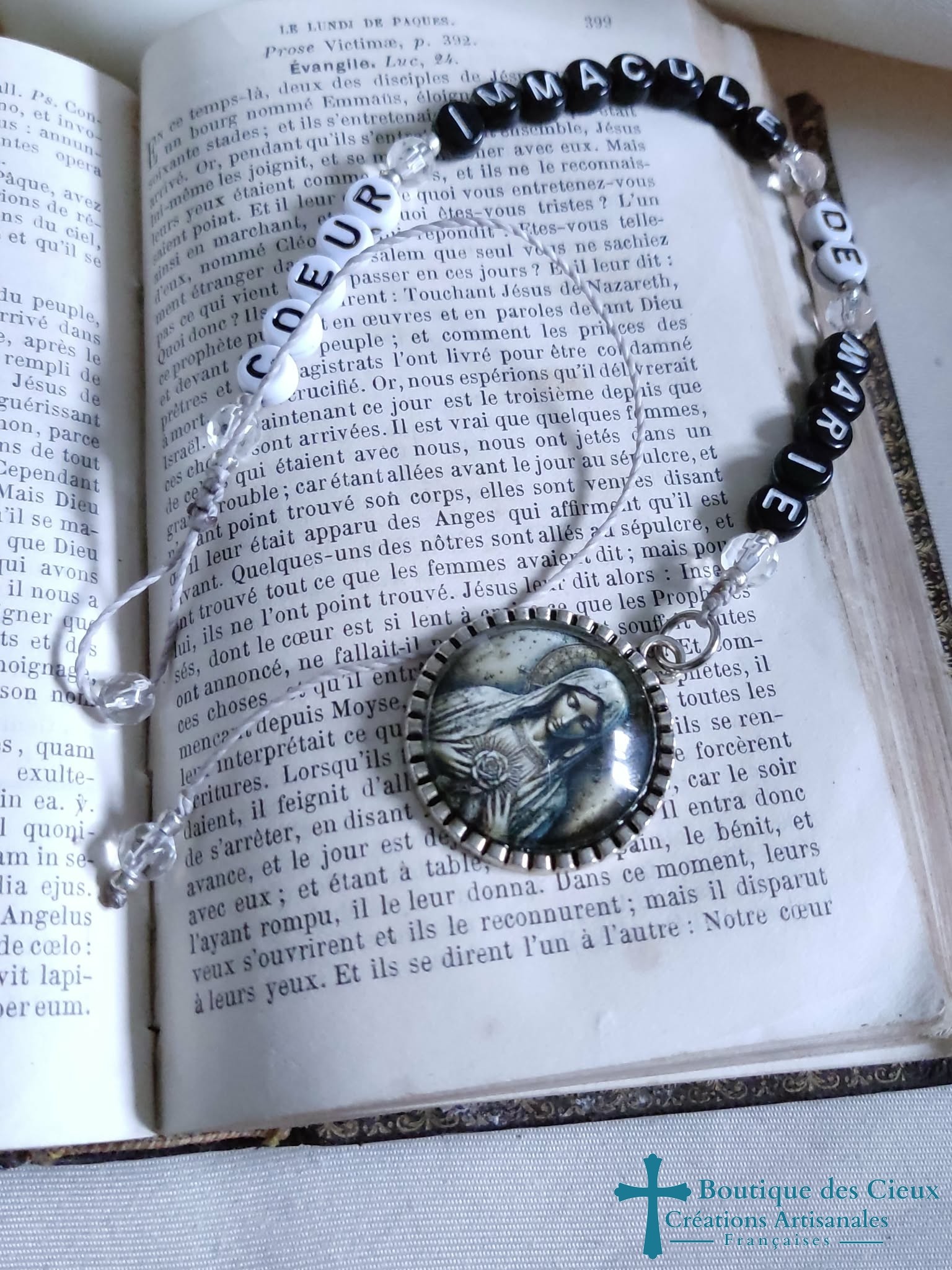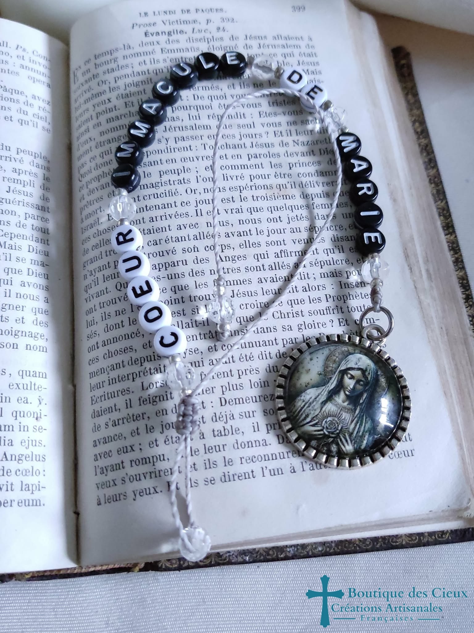 Suspension décorative pour rétroviseur, (par exemple) Sainte Marie et messages : Coeur Immaculé de Marie en perles lettres synthétiqueCes bijoux seront bénis par un prêtre. |