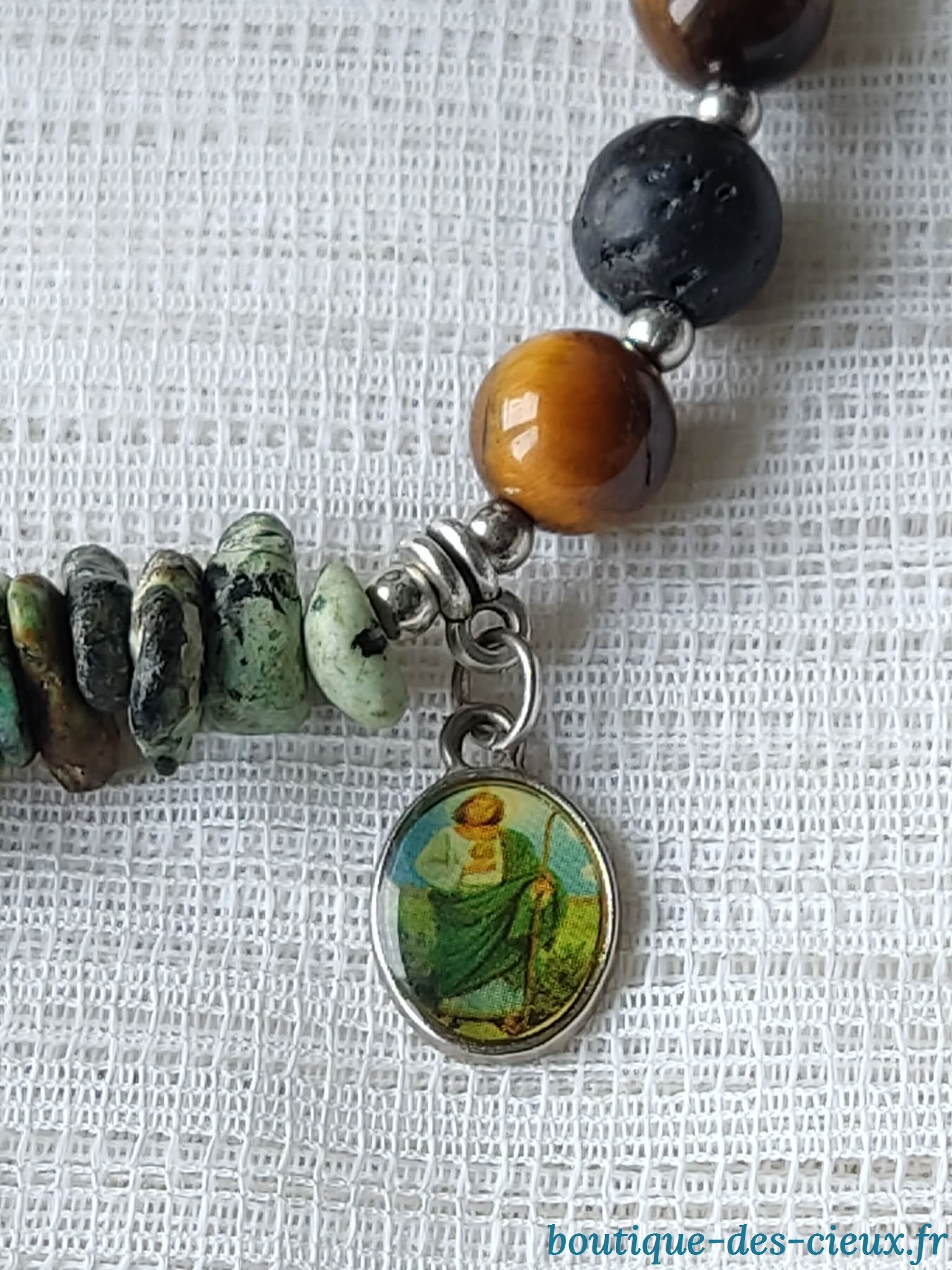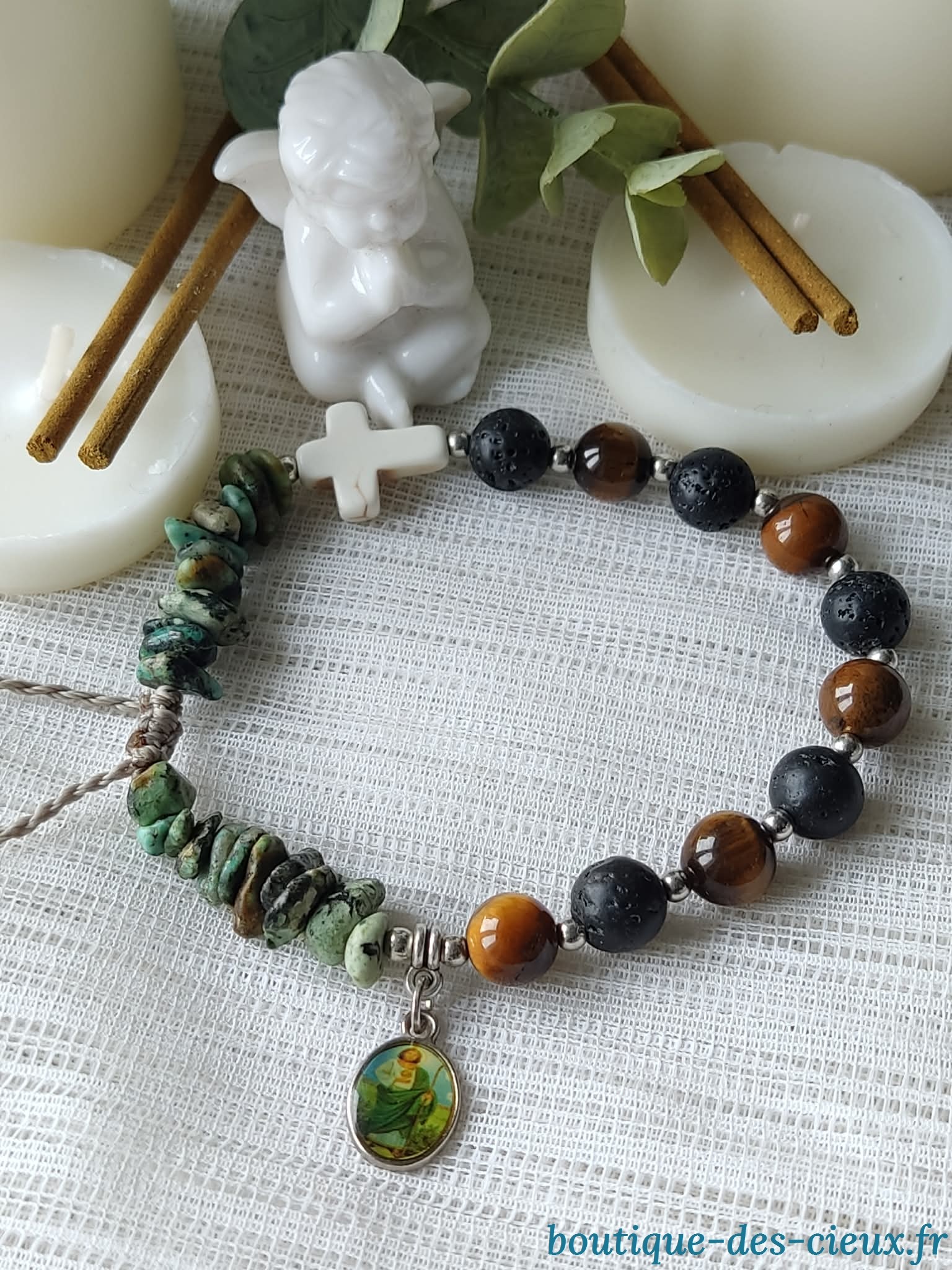 Véritable bijou, ce dizainier à été créé pour avoir l'apparence d'un bracelet ordinaire tout en respectant les étapes de la prière.  Les perles des 10 grains sont facilement discernables pour rester concentré. La croix synthétique façon howlite marque le début de la méditaion et la petite médaille Saint Joseph la fin. (ou l'inverse selon votre choix) Les chip's de turquoises donnent une très belle finition à ce bijoux monté sur un fil polyester, ce qui en fait un bijou très solide et souple.