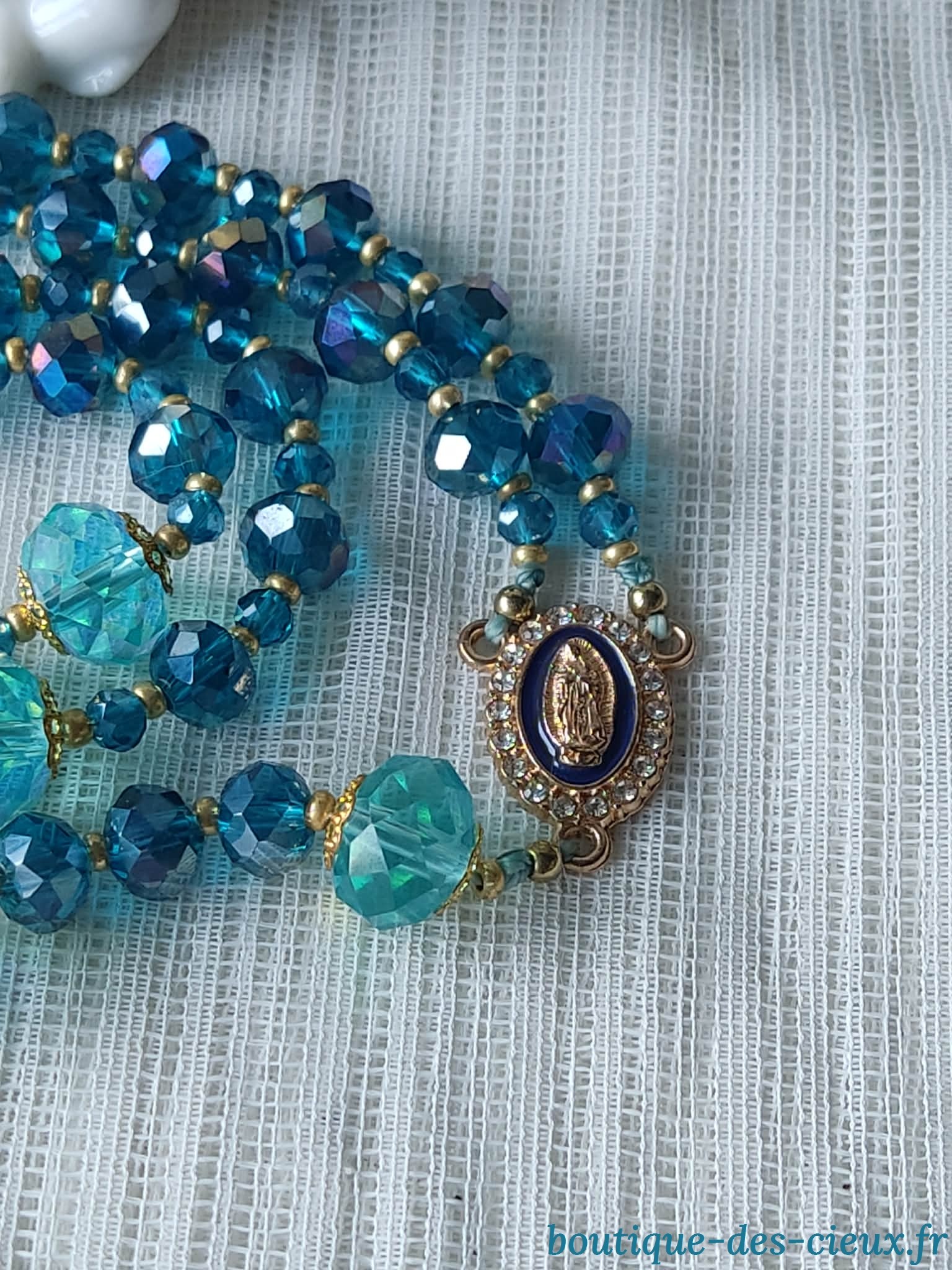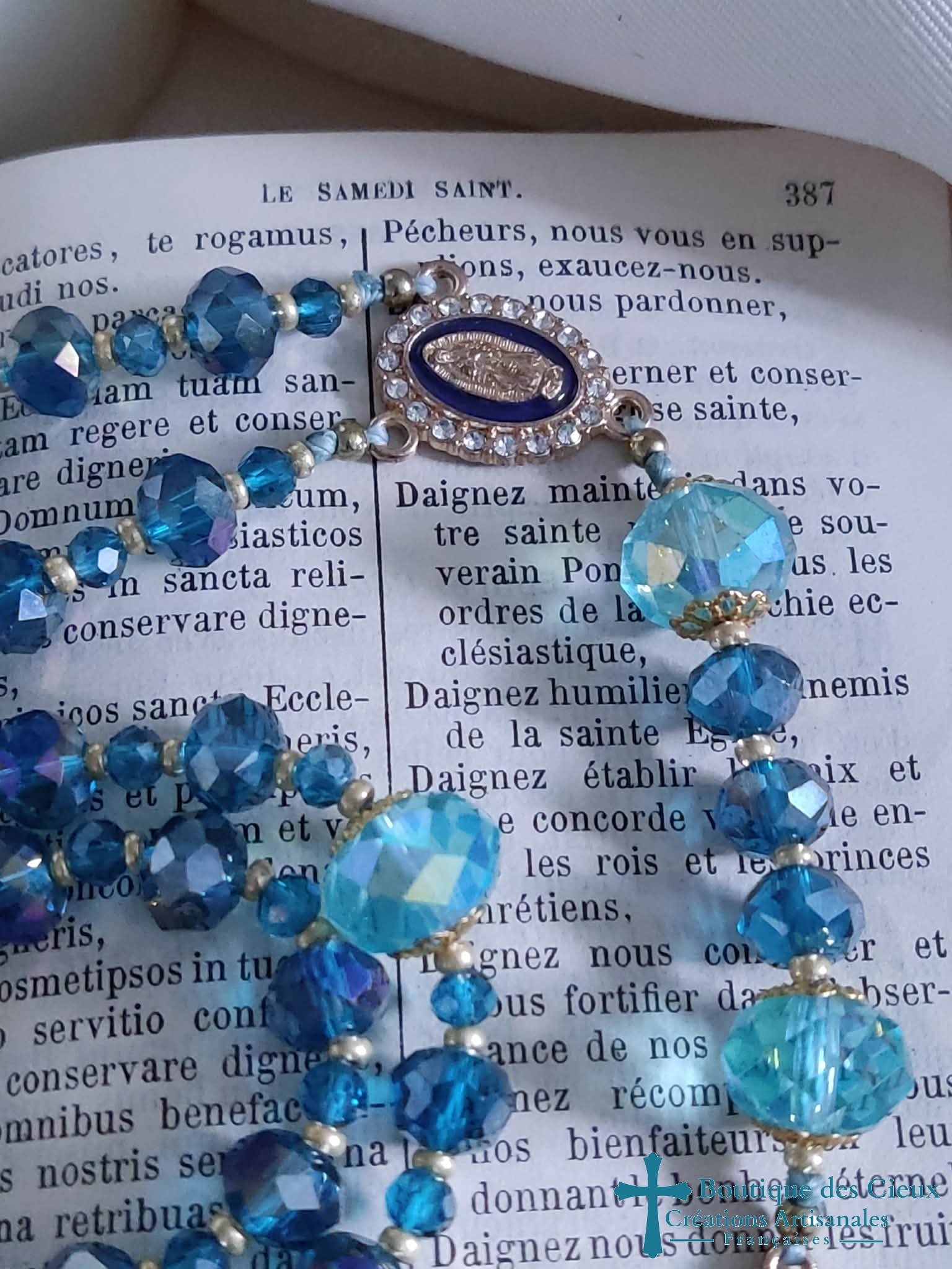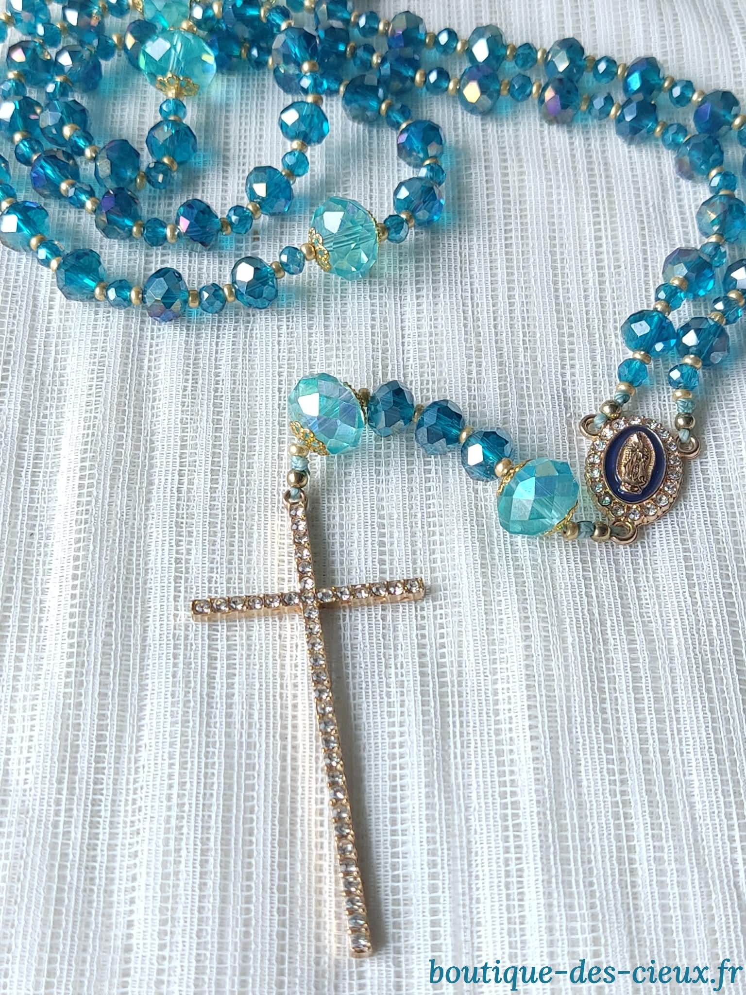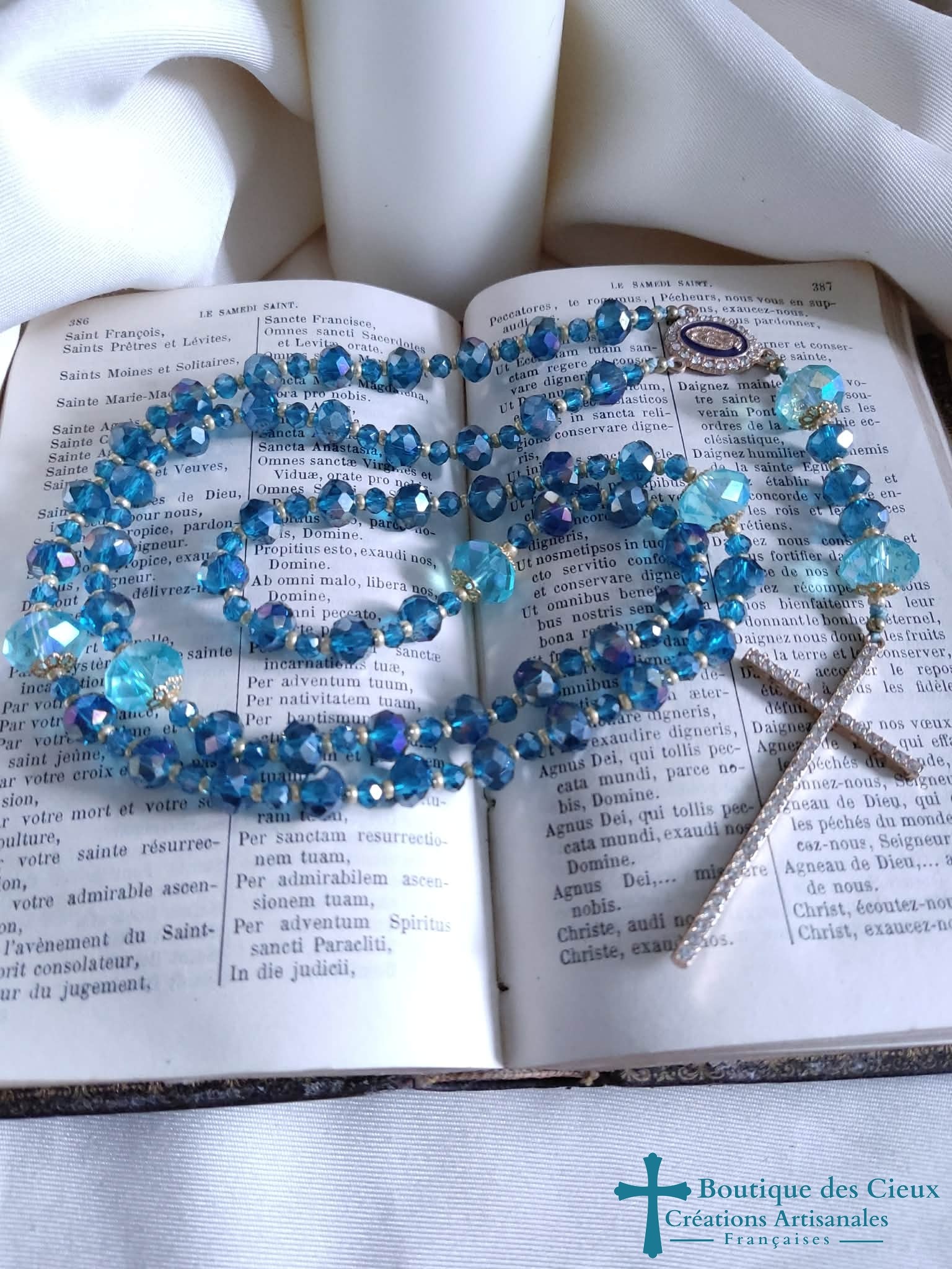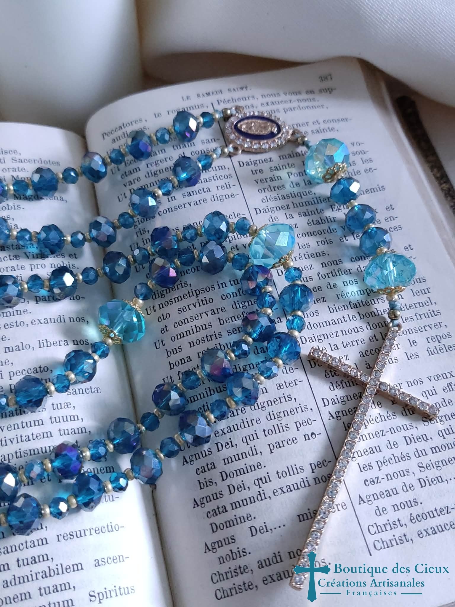 Chapelet composé de perles irisées en verre bleu, et de magnifiques pièces dorées à strass.Entièrement monté à la main, ce grand chapelet chic et scintillant à été créé pour être porté en sautoir, tout en respectant les étapes primordiales de la prière.Les grains des dizaines sont facilement discernables grâce aux petites perles qui les séparent, ainsi qu'à la différence de taille et forme des "Notre Père".