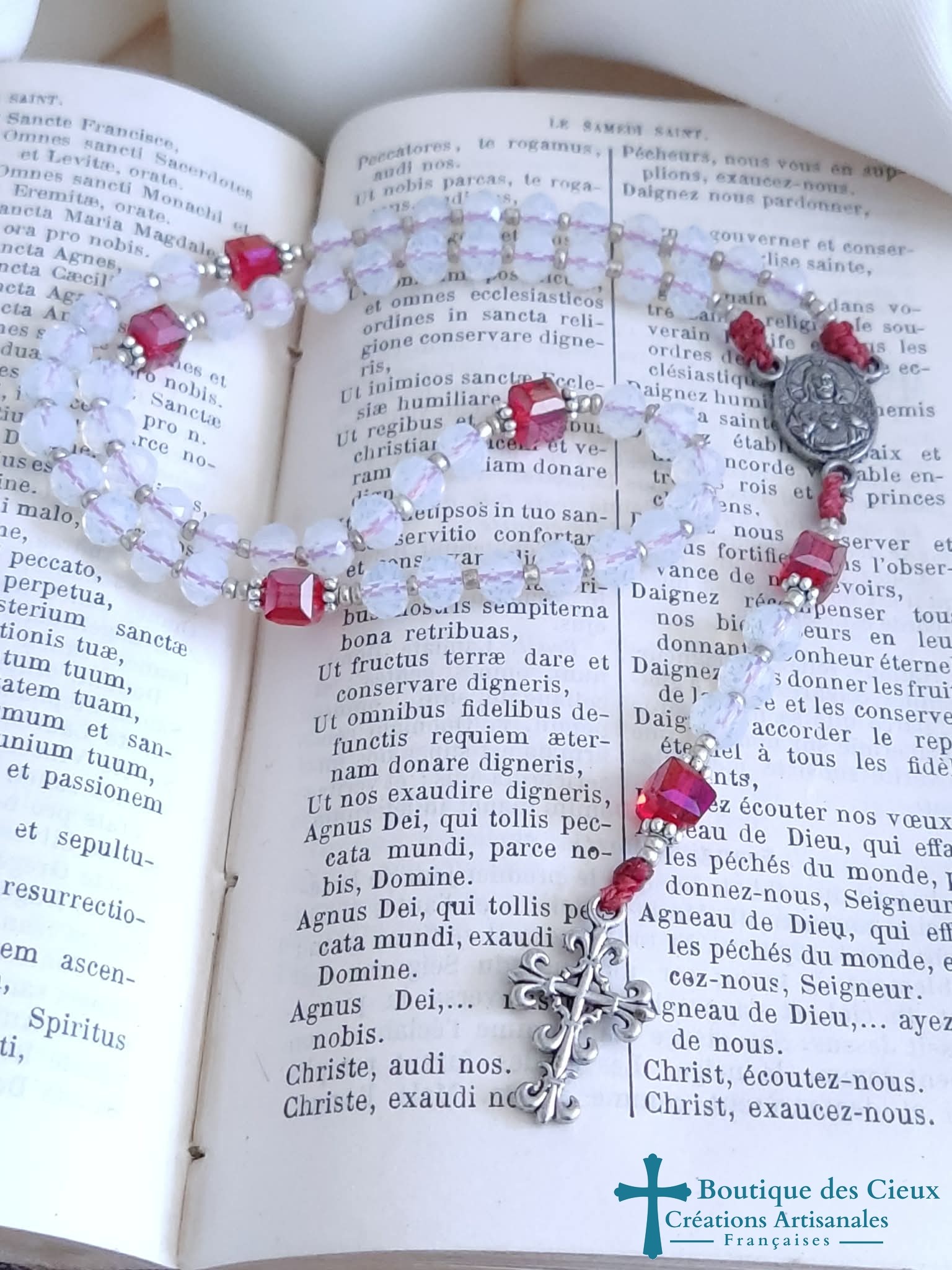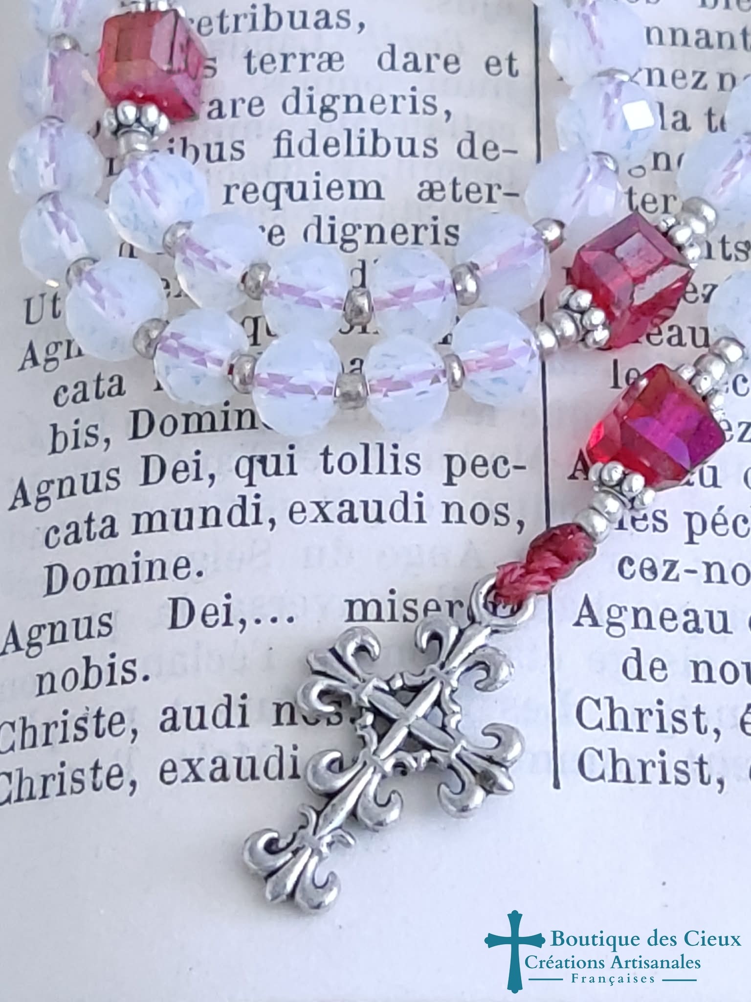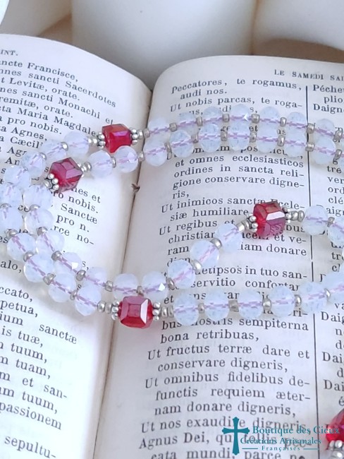 Chapelet Coeur Sacré de Jésus composé de perles facettées en verre blanc, cubes en verre rouge et de pièces en métal argenté.