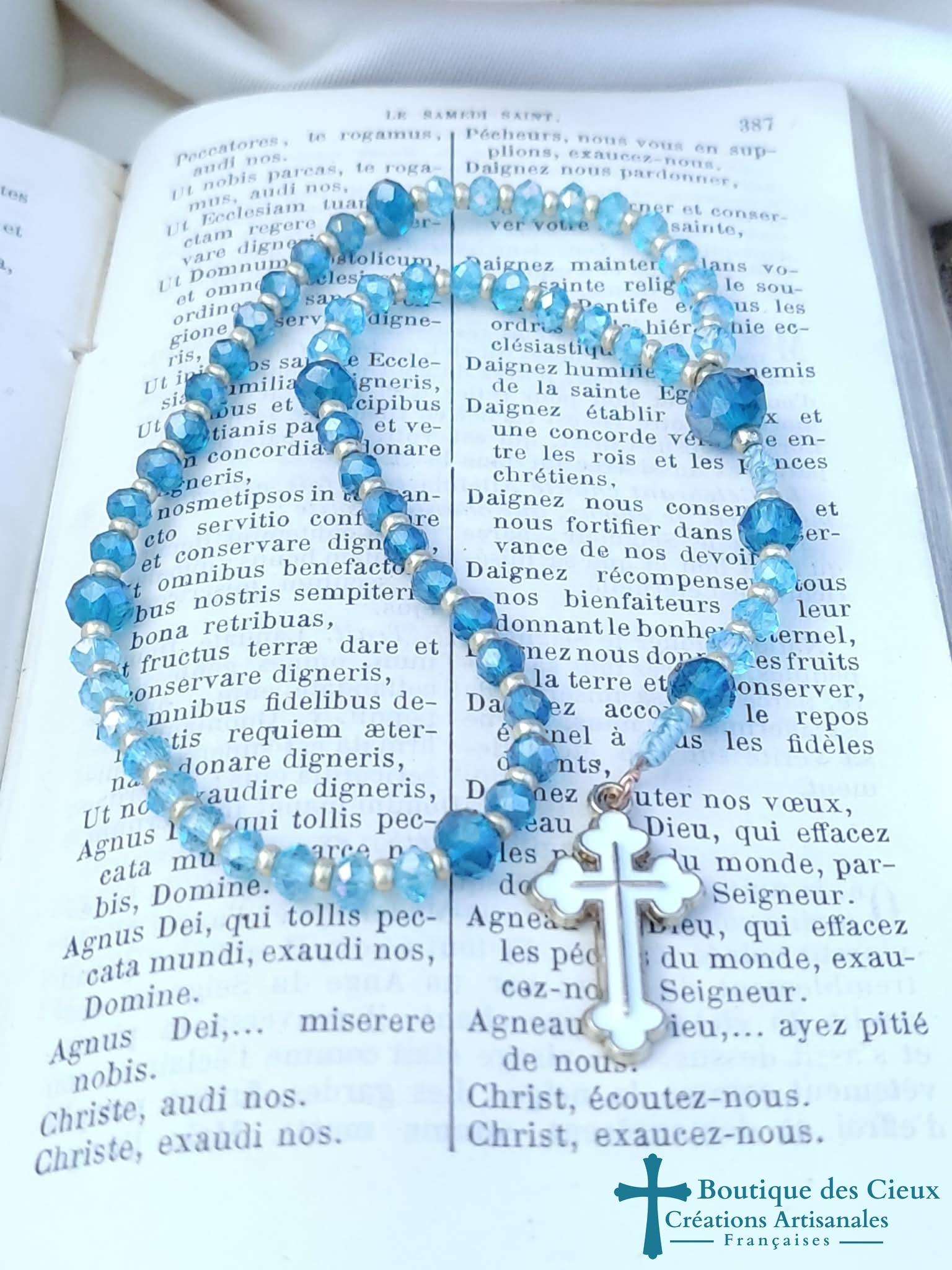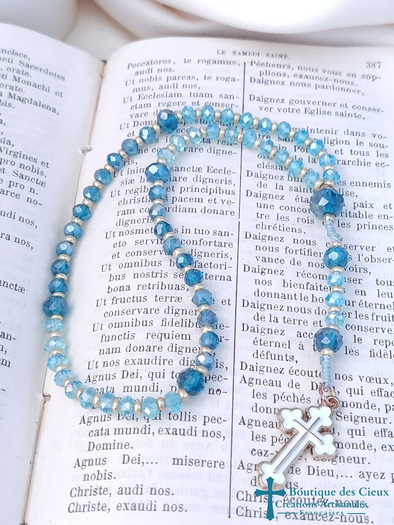 Mini chapelet composé de perles en verre 2 tons de bleus. Les grains des dizaines sont facilement discernables grâce aux petites perles qui les séparent, ainsi qu' avec la différence de forme et taille avec les "Notre Père". Vous souhaitez prier le chapelet, mais ne savez pas comment procéder : rendez vous dans les pages à votre disposition. Vous y trouverez des explications et un livret complet téléchargeable en format pdf vous y est offert. |
