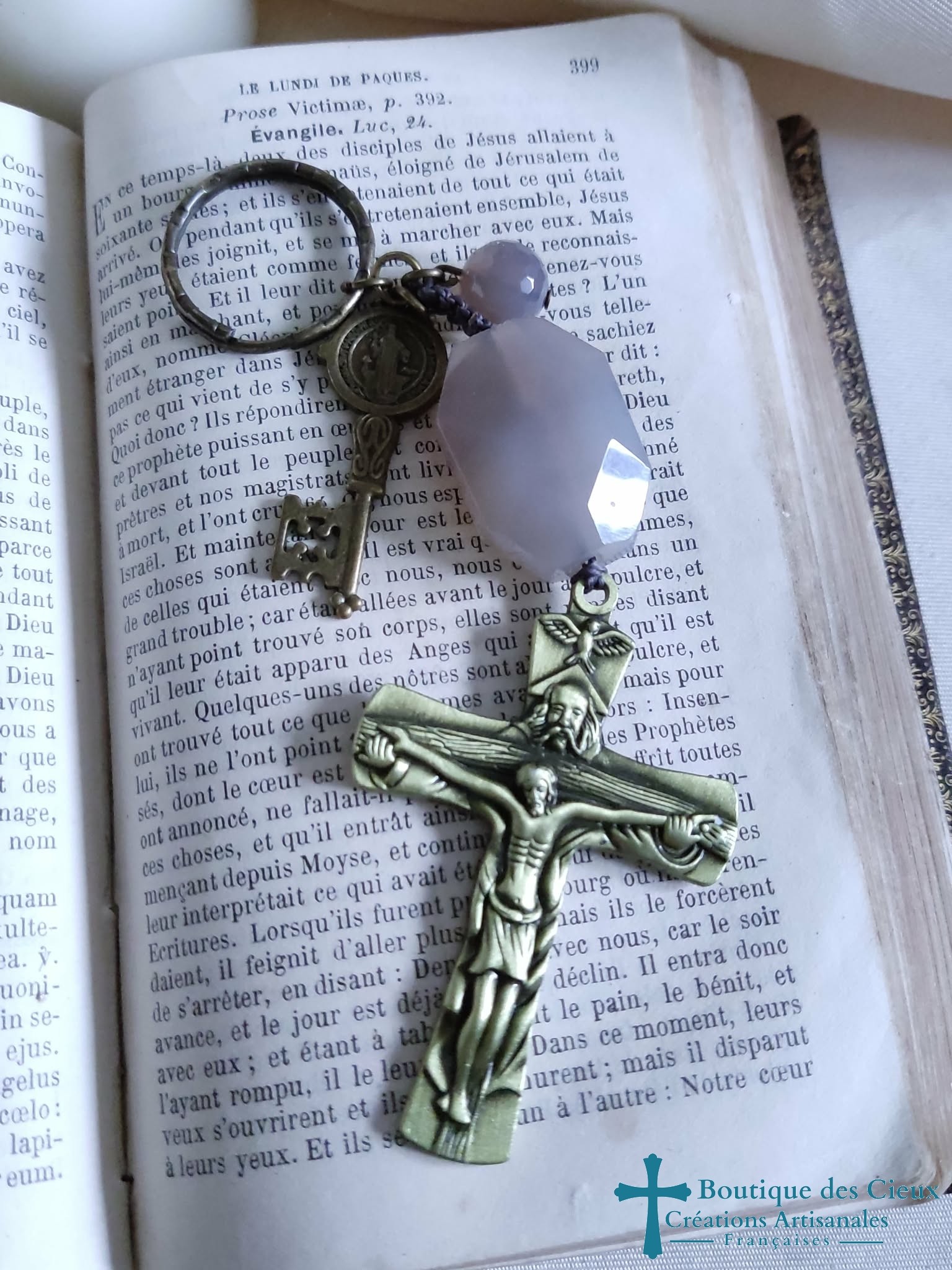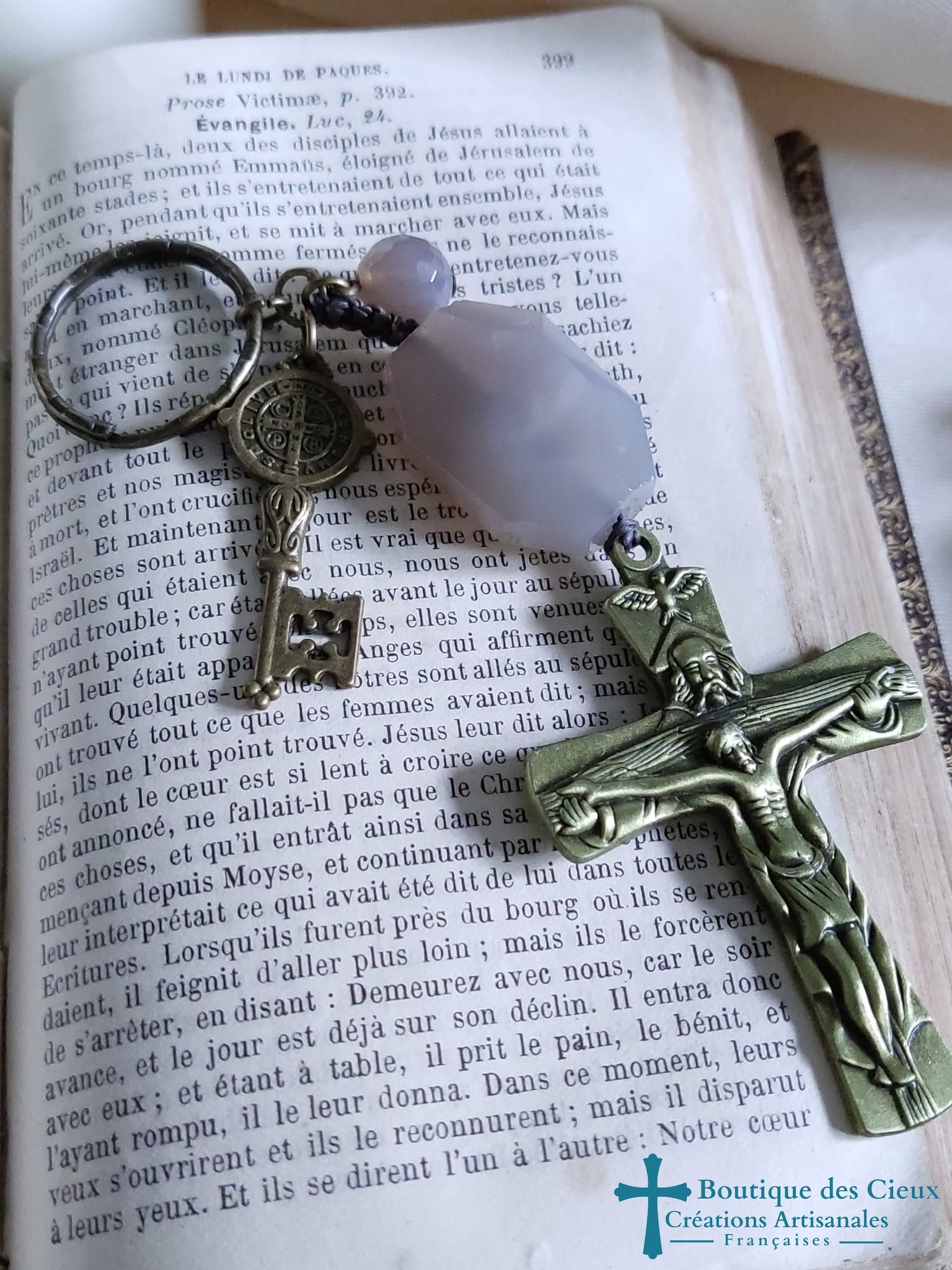 Porte-clés chrétien en agate grise avec croix Jésus et Saint Esprit en métal bronze |