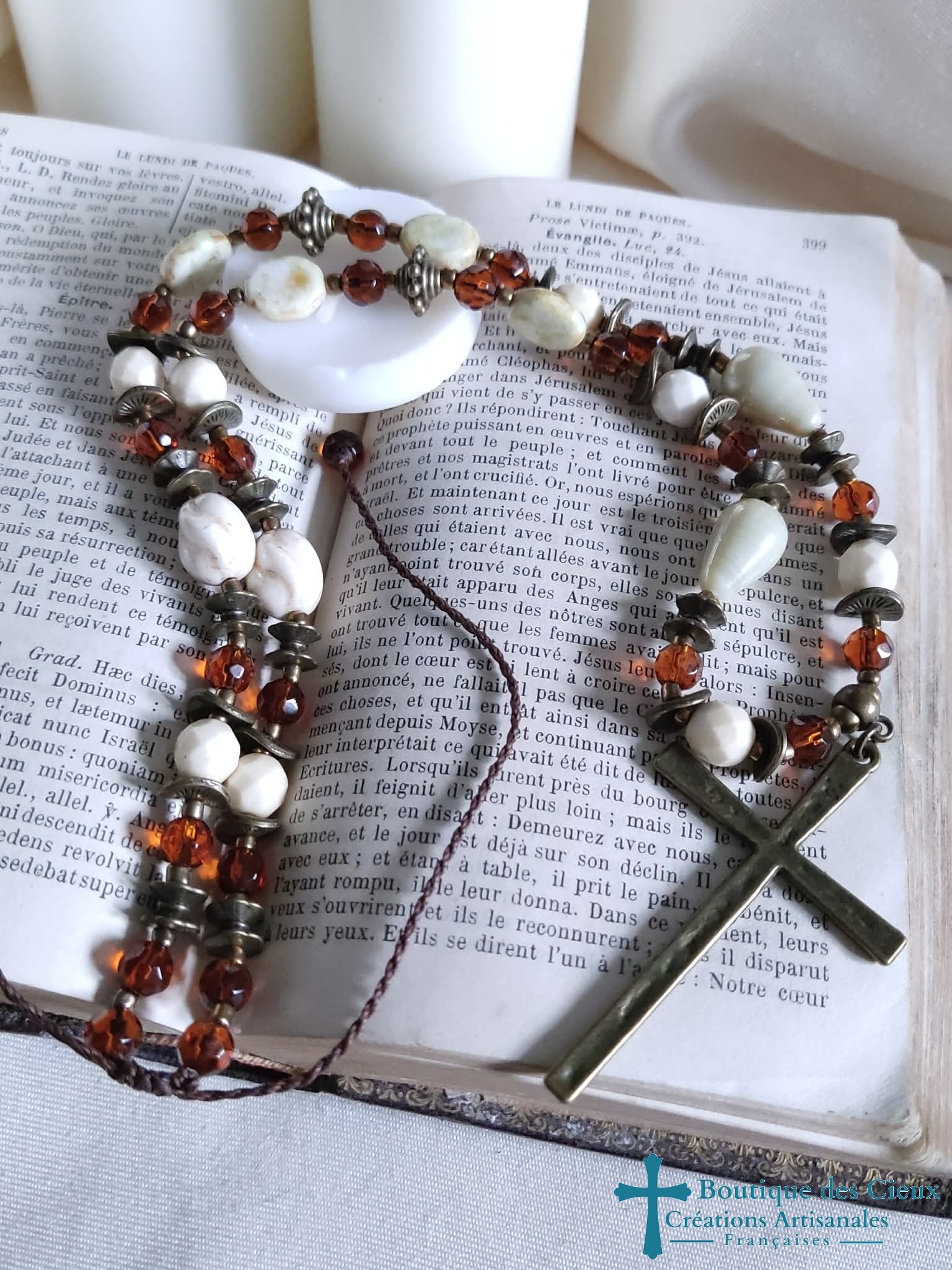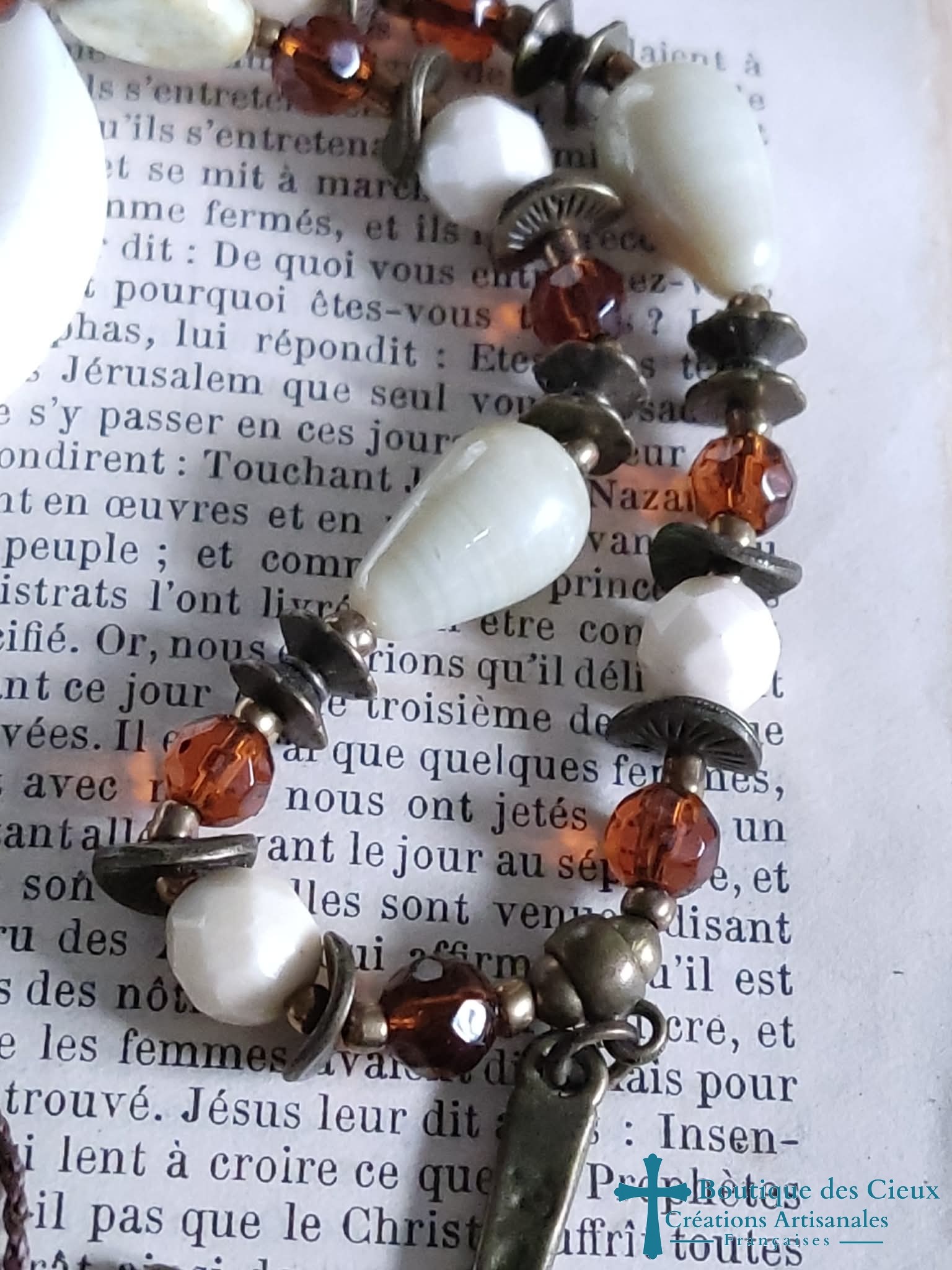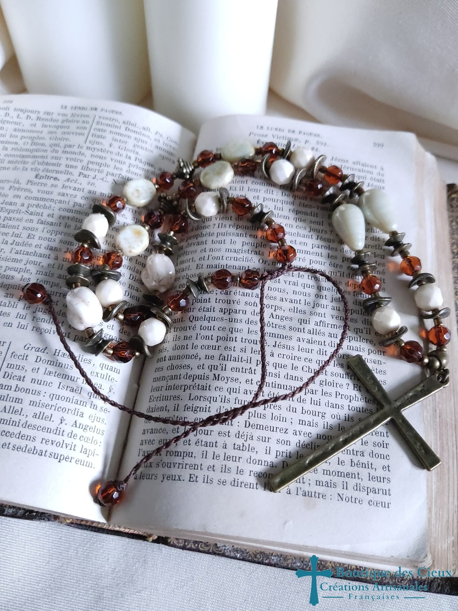 Le mélange de perles dans les tons marron / crème et de diverses matières dans un parfait équilibre donne à ce sautoir un style ethinique chic . Entièrement monté à la main sur un fil polyester, ce sautoir est réglable grâce à la longueur de fil de rallonge et son fermoir coulissant. Tous nos bijoux sont pensés et créés avec créativité et originalité pour vous permettre d'exprimer votre foi en douceur tout en vous sublimant, comme le ferait tout bijou sans vocation chrétienne Ce bijou sera béni par un prêtre. |
