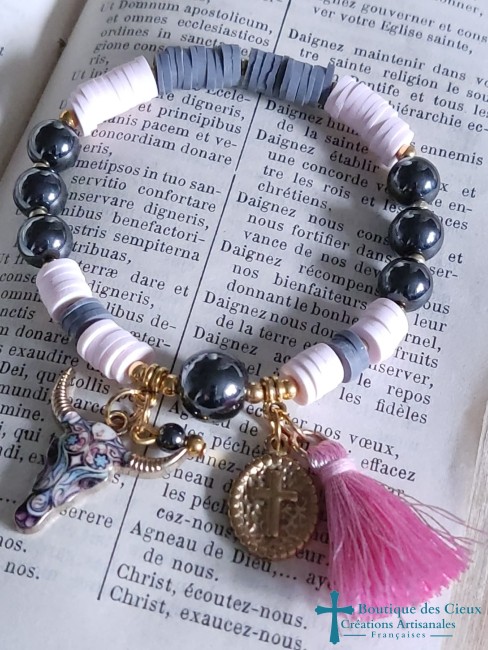 Bracelet artisanal en heishi rose et gris Médaille croix dorée Tête de buffle