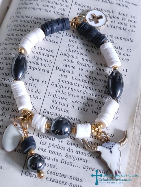 Bracelet artisanal en Heishi breloque croix et tête de buffle