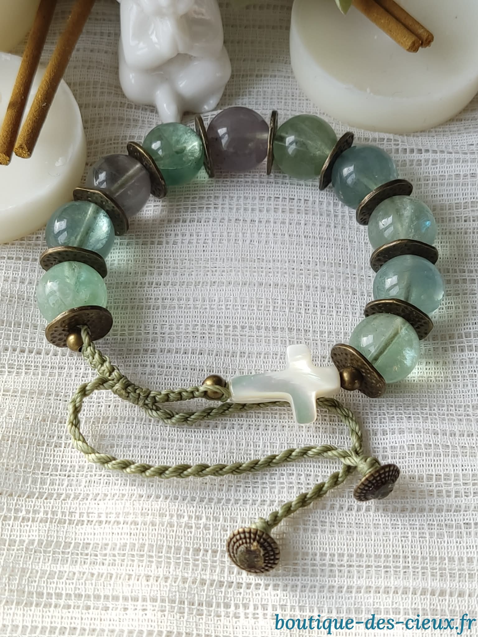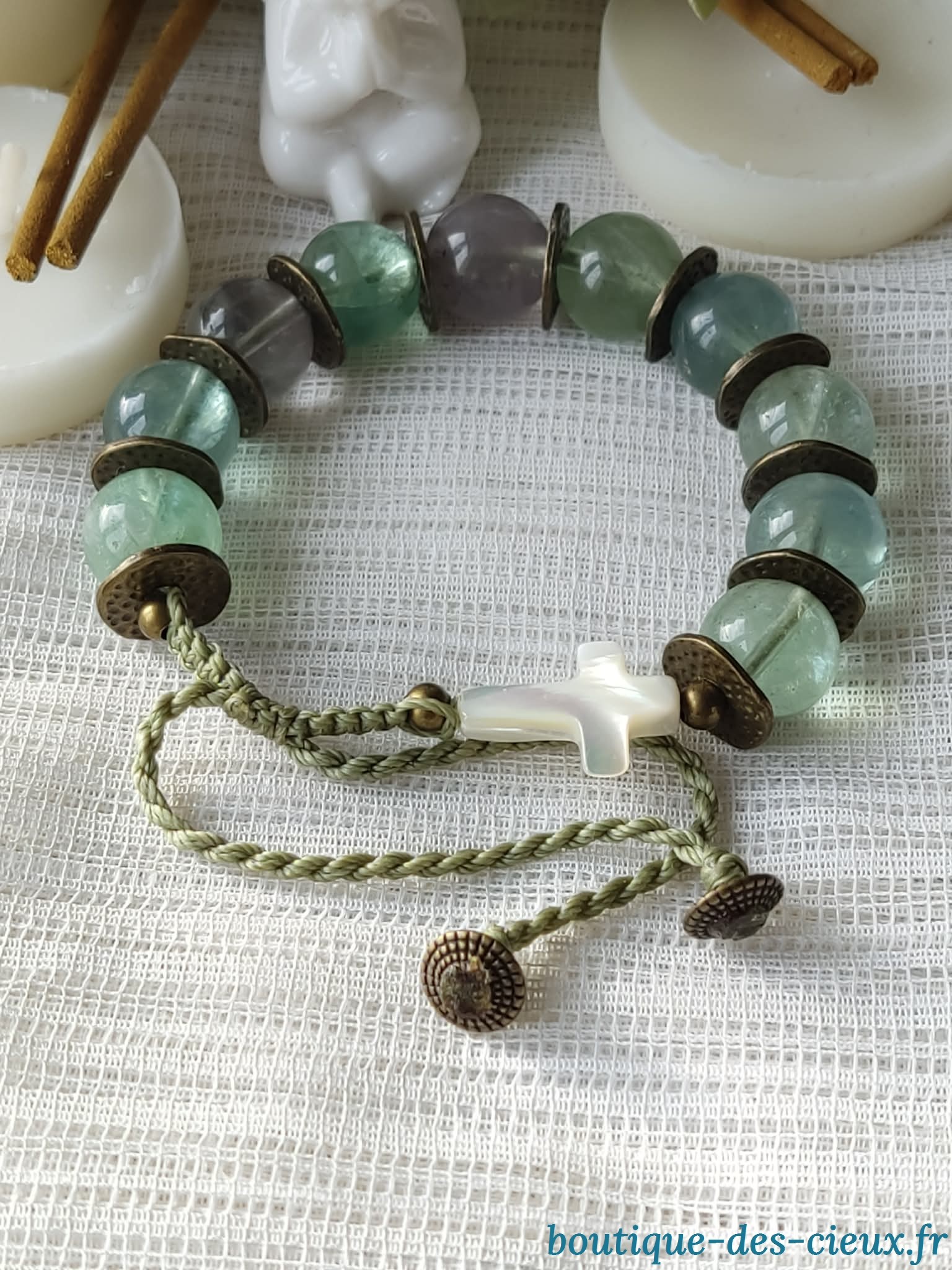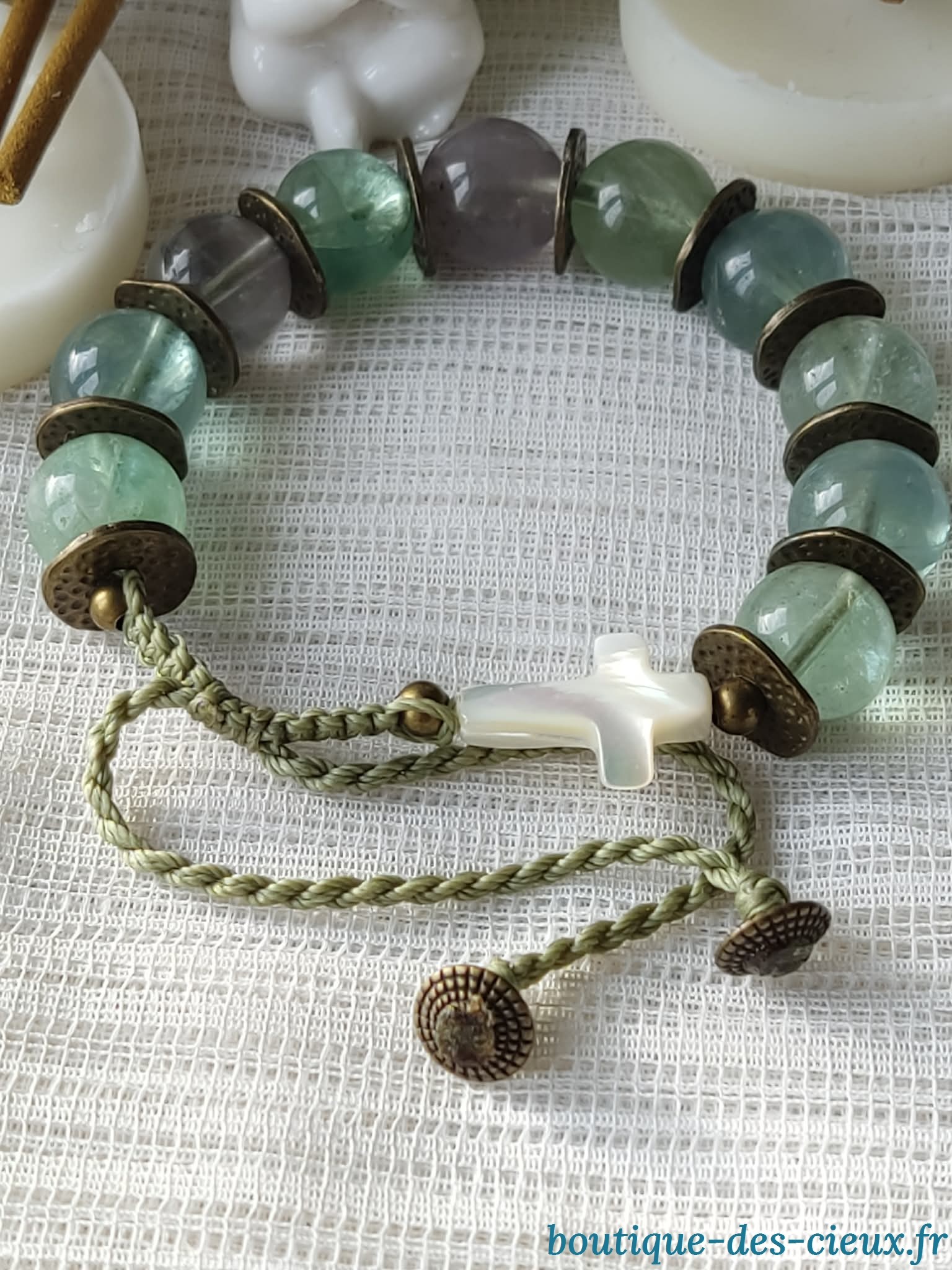 Bracelet dizainier pour femme composé de grosses perles de fluorite ([ou fluorine] (pierre de sagesse, calme le mental) et de pièces en métal bronze.Véritable bijou ce dizainier à été créé pour avoir l'apparence d'un bracelet ordinaire de style ethnique tout en respectant les étapes de la prière. En effet, il possède 10 grosses perles séparées par des disques fins en métal bronze, en guise de grains facilement discernables pour rester concentré. La jolie croix en nacre blanche naturelle marque le début de la méditation, et le fermoir (glissant qui permet d'adapter le bijou à votre poignet) la fin.Entièrement monté à la main sur du fil polyester à macramé, ce bijou est réglables grâce à son fermoir coulissant. |