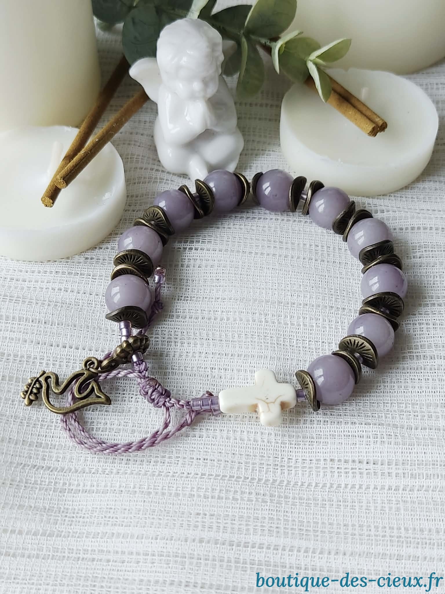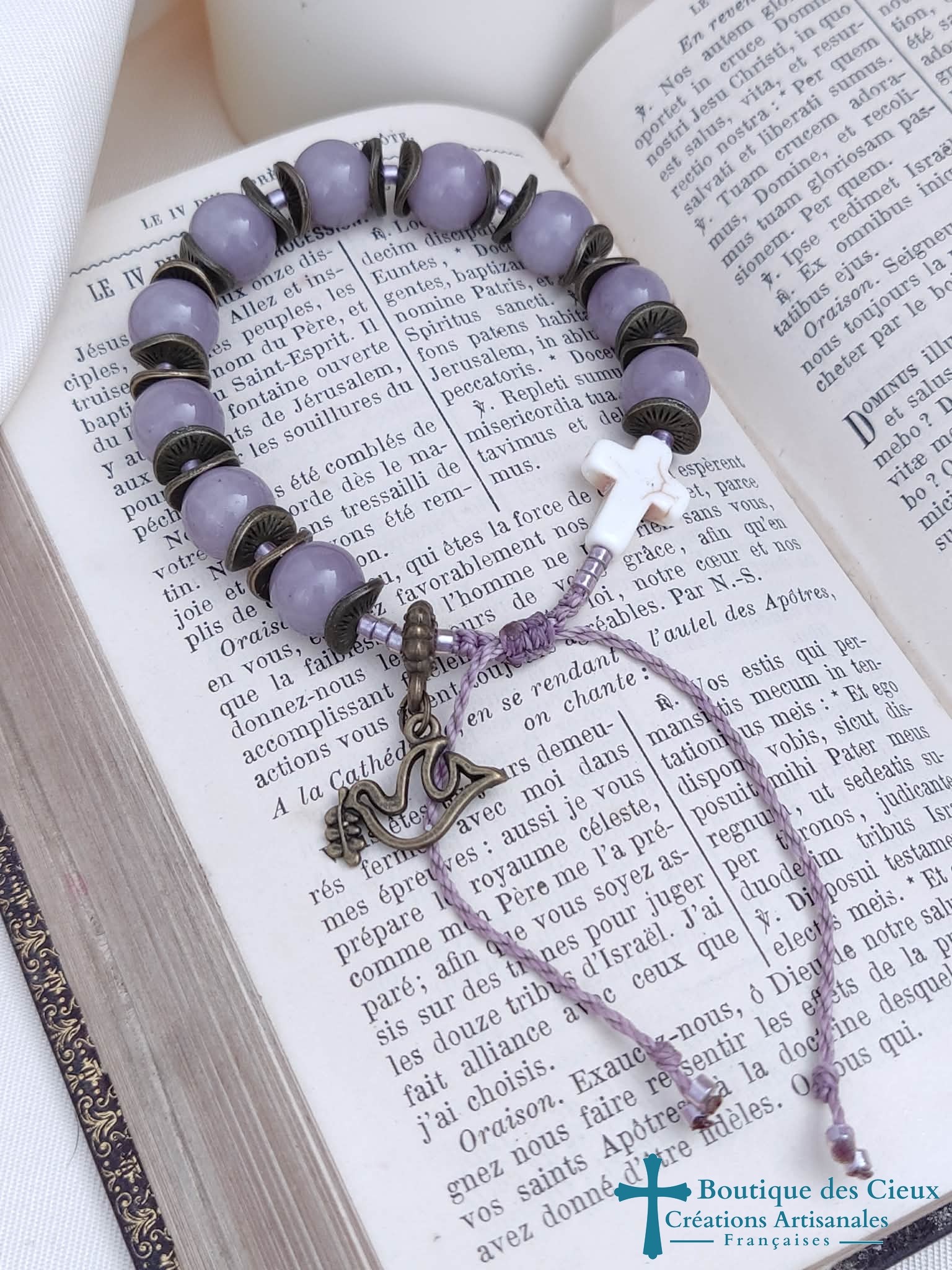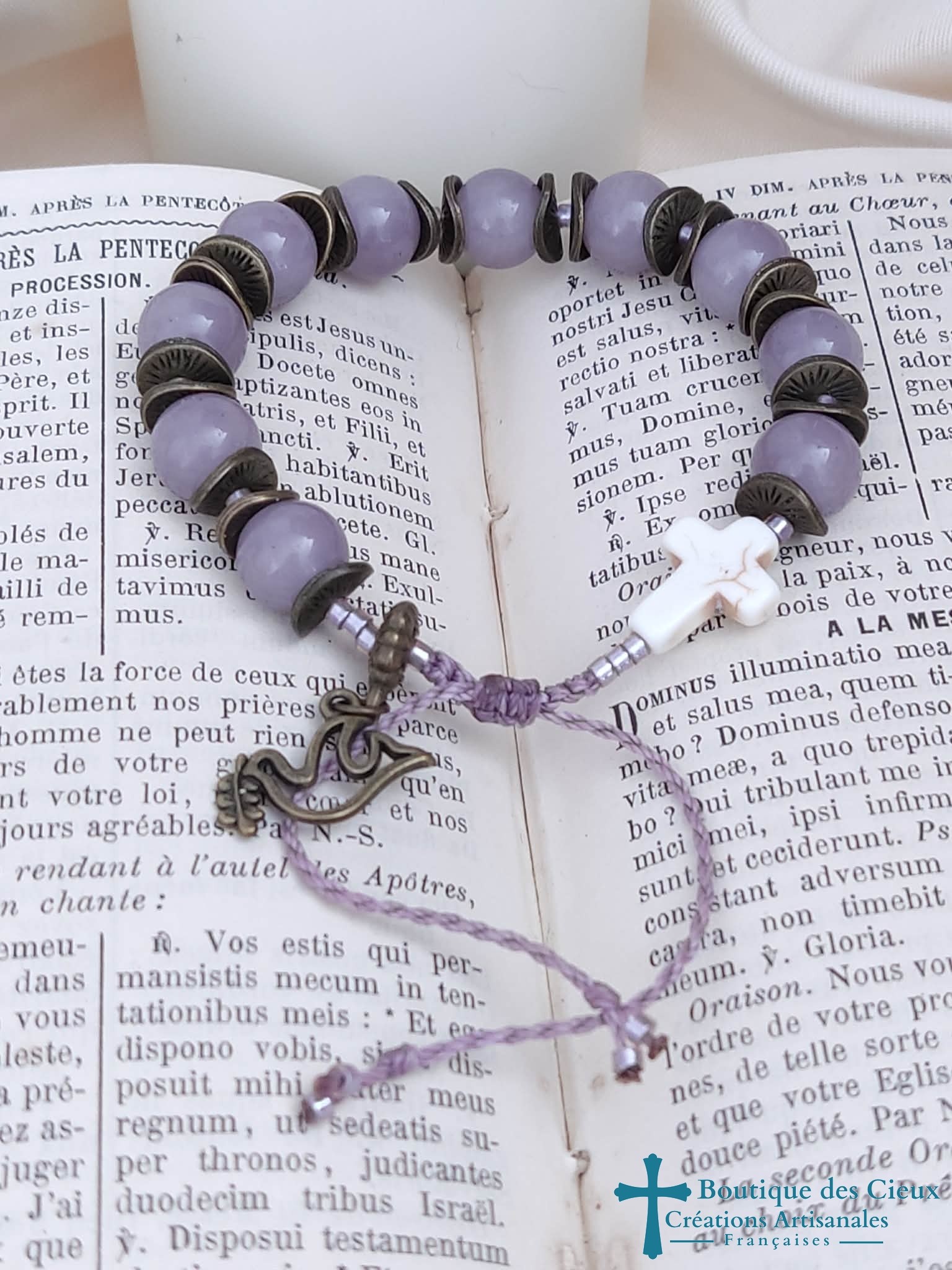 Dizainier pour femme composé de perles en verre et de pièces en métal bronze.Ce dizainier à été créé pour avoir l'apparence d'un bracelet de style ethnique tout en respectant les étapes la prière. Les grains sont facilement discernables, la croix marque le début de la méditation, et la colombe de la paix la fin (ou l'inverse selon votre envie).Entièrement monté à la main sur du fil polyester à macramé (solide et souple) , il est réglable grâce à son fermoir coulissant.