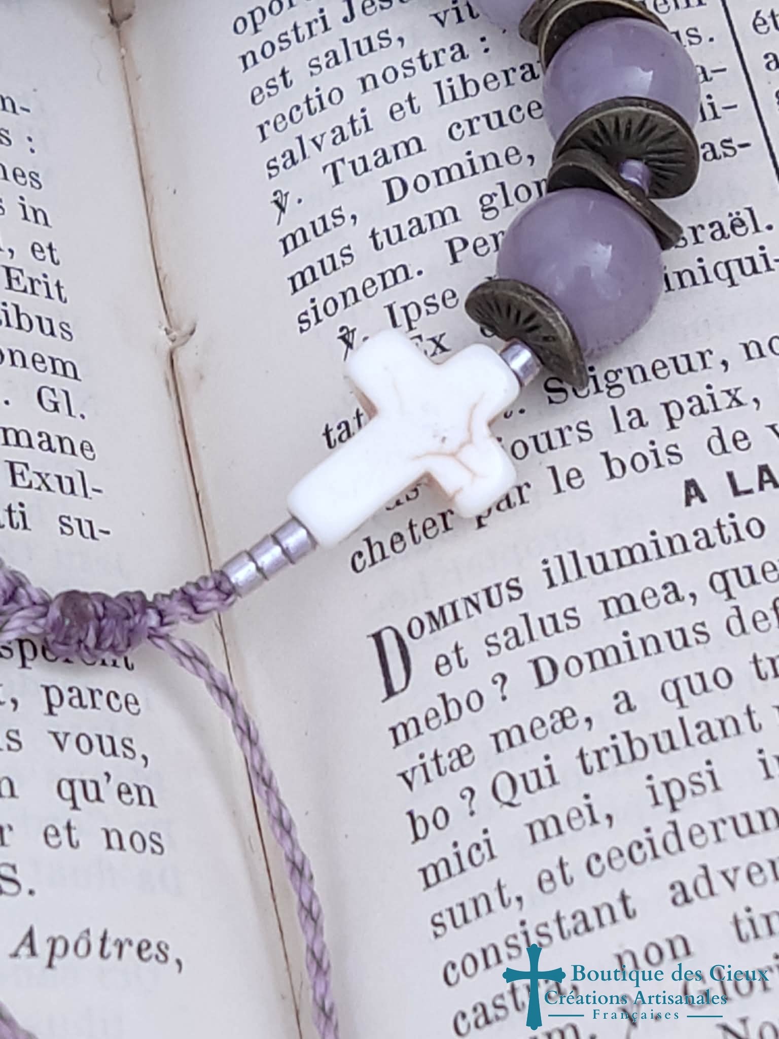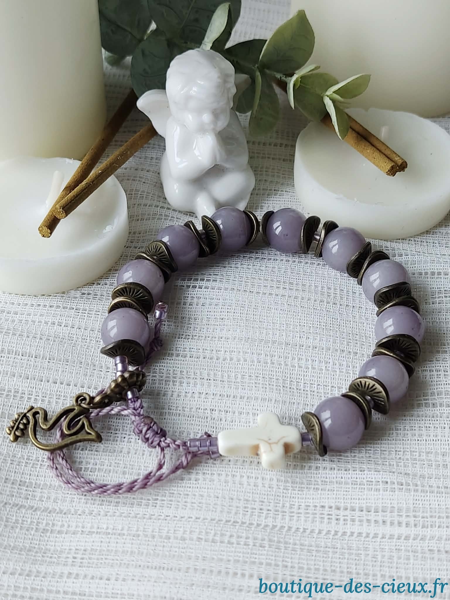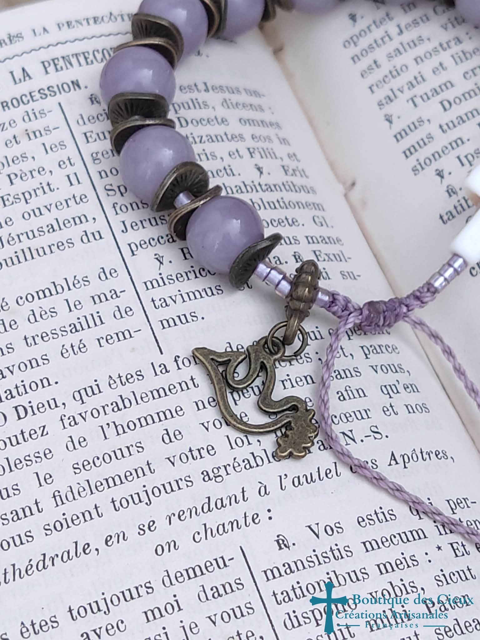 Dizainier pour femme composé de perles en verre et de pièces en métal bronze.Ce dizainier à été créé pour avoir l'apparence d'un bracelet de style ethnique tout en respectant les étapes la prière. Les grains sont facilement discernables, la croix marque le début de la méditation, et la colombe de la paix la fin (ou l'inverse selon votre envie).Entièrement monté à la main sur du fil polyester à macramé (solide et souple) , il est réglable grâce à son fermoir coulissant.
